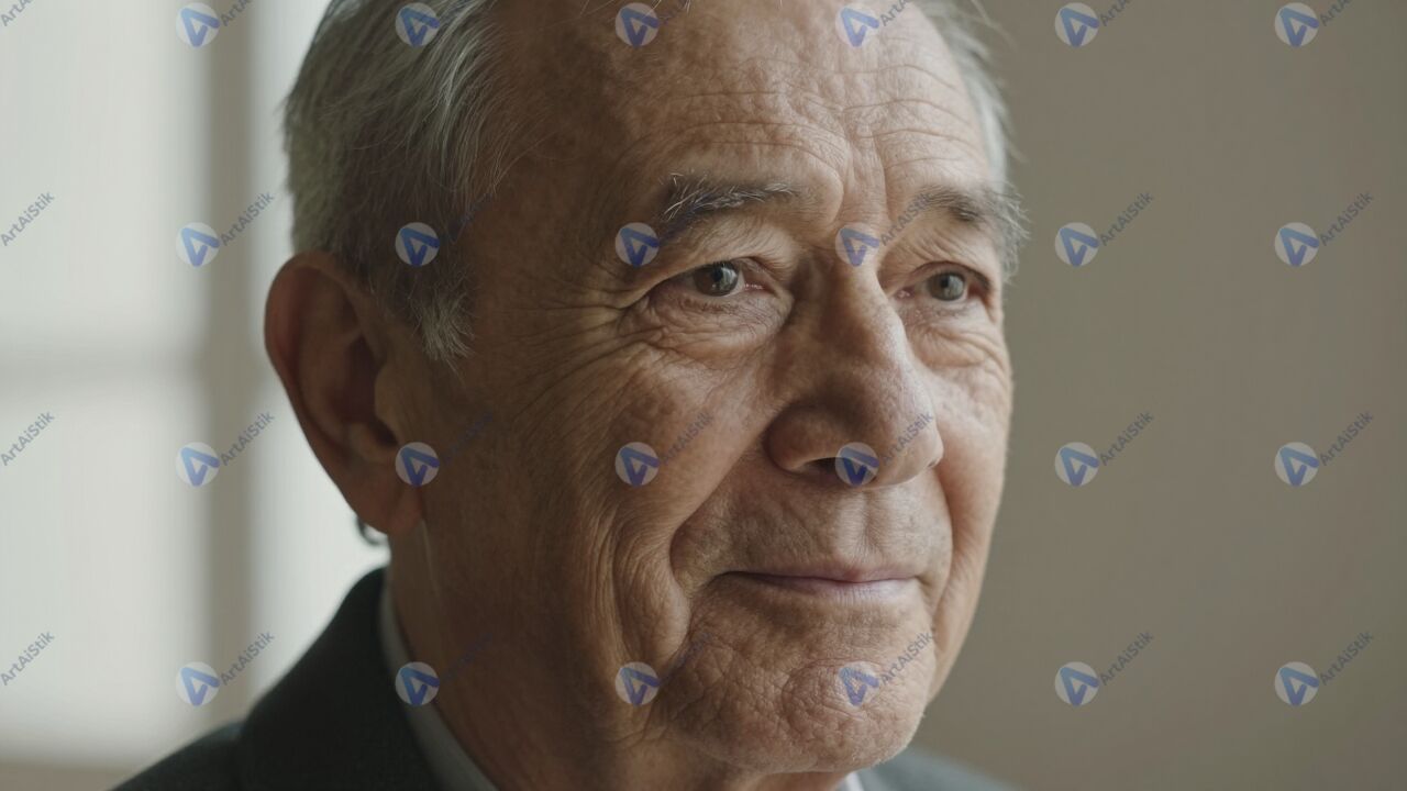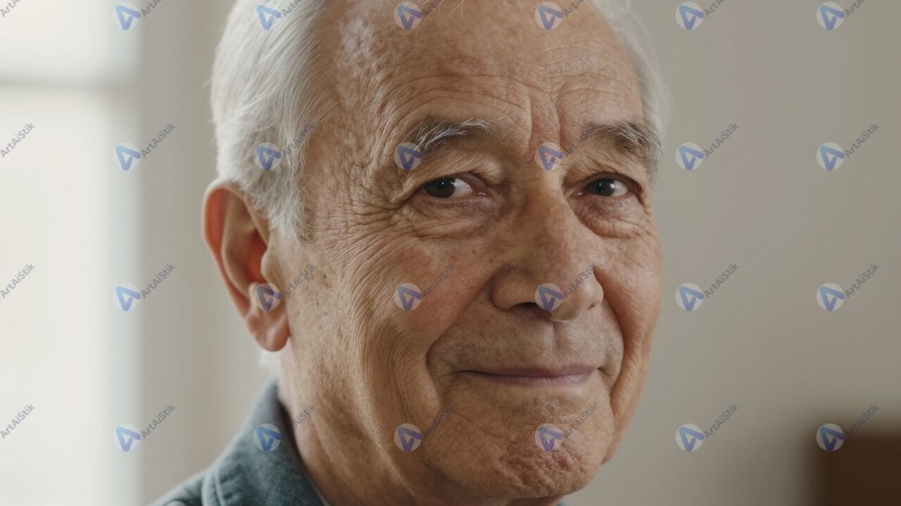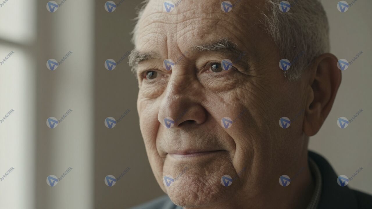 Возрастной портрет мужчины показывает лицо с выраженными морщинами, которые подчёркивают прожитый опыт и создают ощущение мудрости и спокойствия. Мягкий боковой свет падает из окна, выделяет контуры щёк, носа и лба, а также делает взгляд глубоким и немного задумчивым. Глаза героя направлены чуть в сторону от камеры, но лёгкая улыбка на губах добавляет кадру дружелюбия и тепла, поэтому возрастной портрет мужчины воспринимается очень человечным и искренним. Фон остаётся нейтральным и слегка размытым, чтобы внимание полностью сосредоточилось на выражении лица и деталях кожи. Такое изображение подойдёт для социальных проектов, материалов о старшем поколении, рекламных кампаний, подчёркивающих заботу и уважение, а также для редакционных историй о жизненном опыте и семейных ценностях.