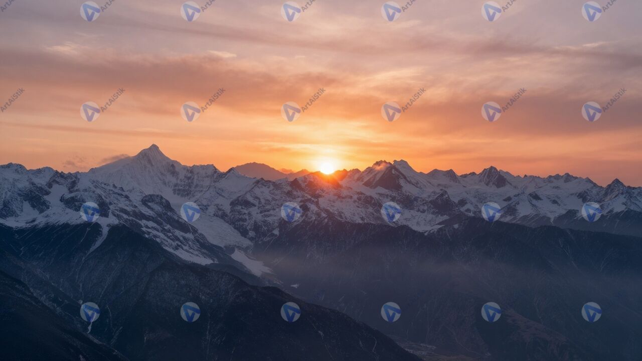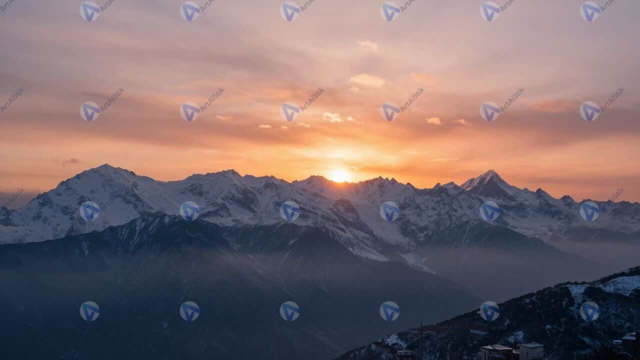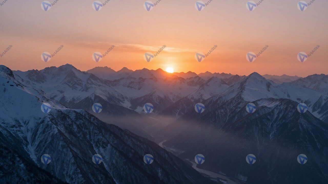 Яркий закат над заснеженными горами, лучи солнца отражаются на снежных вершинах, небо окрашено в оранжевые и розовые оттенки, лёгкая дымка над долиной, спокойная атмосфера, свежий воздух, величие природы