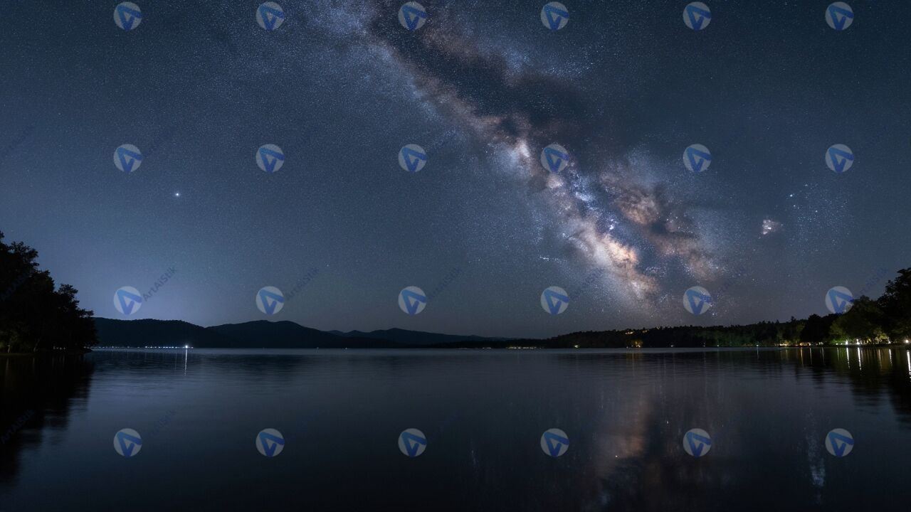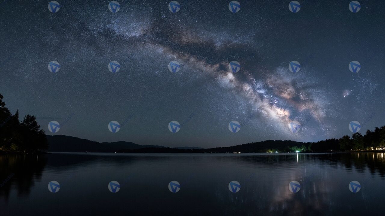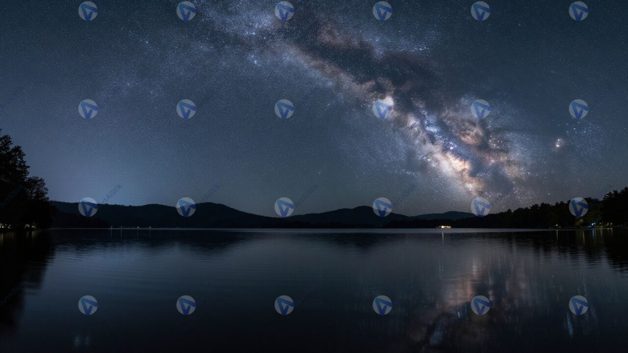 Ночное звездное небо раскинулось над гладкой поверхностью озера, в котором отражаются многочисленные точки света и слабый контур Млечного Пути. На горизонте видны тёмные силуэты деревьев и низких холмов, которые создают естественную рамку для композиции и подчёркивают глубину пространства. В кадре почти нет искусственного освещения, поэтому ночное звездное небо выглядит особенно ярким и контрастным, а воздух кажется чистым и прохладным. Вода остаётся спокойной, лишь лёгкие ряби слегка искажают отражения и добавляют сцене живости. Такое изображение подойдёт для научно‑популярных проектов, материалов о путешествиях, постеров с мотивационными цитатами и визуальных историй о созерцании и тишине.