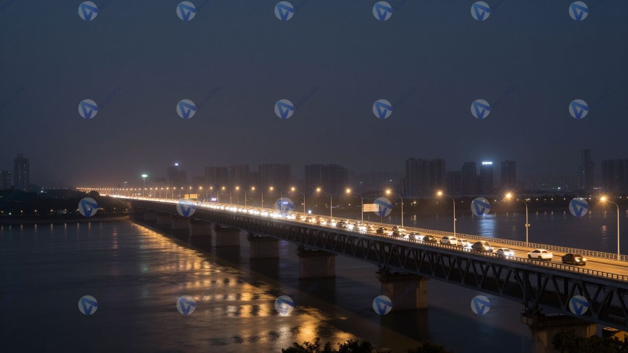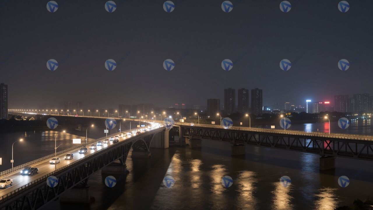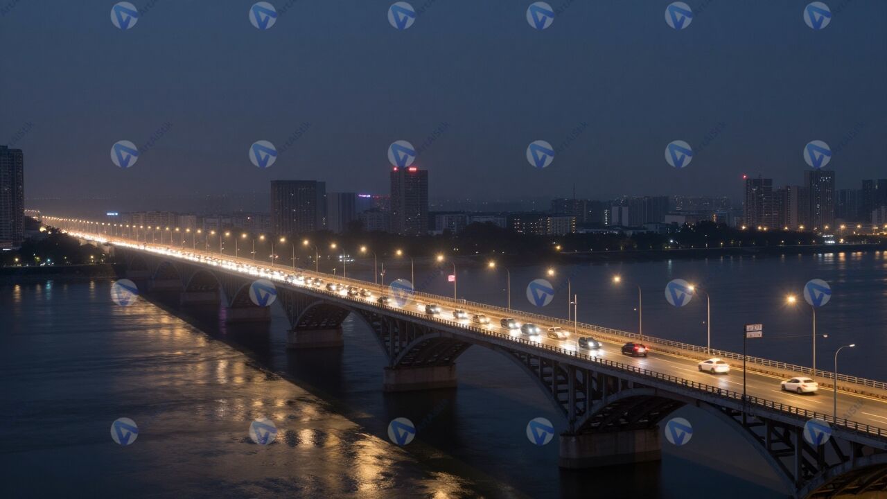 Ночной городской мост изображает широкую конструкцию, перекинутую через реку, где по нескольким полосам движения тянутся яркие цепочки фар и габаритных огней. Тёмное небо служит фоном, а свет фонарей и рекламных щитов подчёркивает линии перил и опор, поэтому ночной городской мост выглядит особенно выразительным. Внизу спокойная вода отражает разноцветные огни и создаёт мягкие вертикальные блики, которые визуально удлиняют композицию и добавляют глубину кадру. На дальнем плане можно различить контуры городской застройки и отдельные высотные здания, а также слабое свечение неоновых вывесок. Лёгкая дымка над рекой придаёт атмосфере немного таинственности, но сцена остаётся дружелюбной и пригодной для городской прогулки. Такое изображение подойдёт для иллюстрации урбанистических проектов, туристических материалов о ночной жизни города и обложек музыкальных плейлистов с расслабляющим настроением.