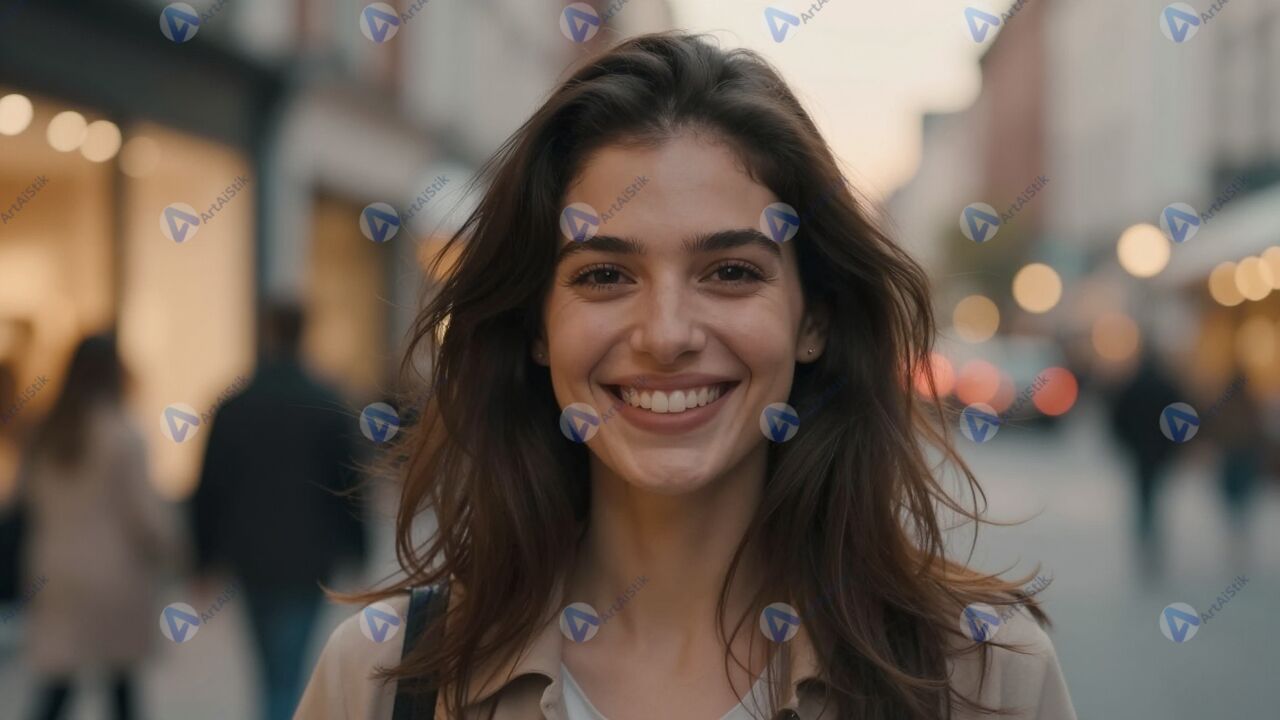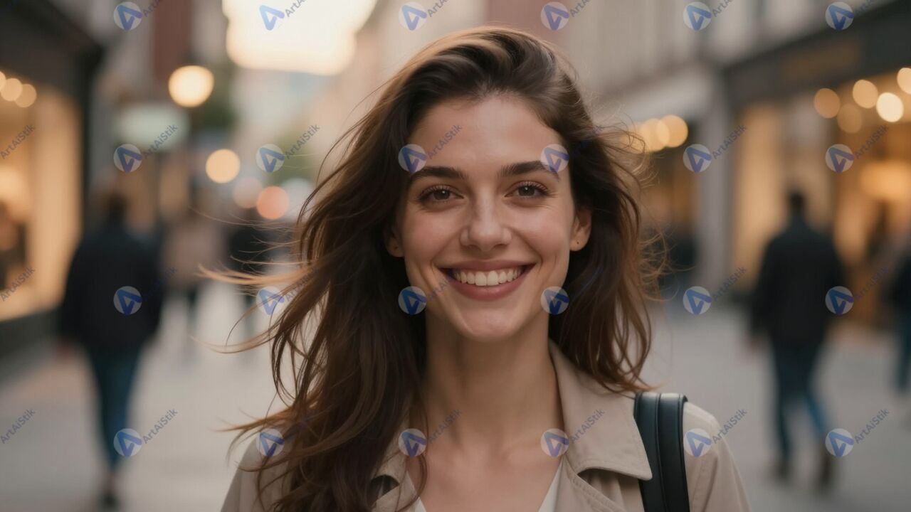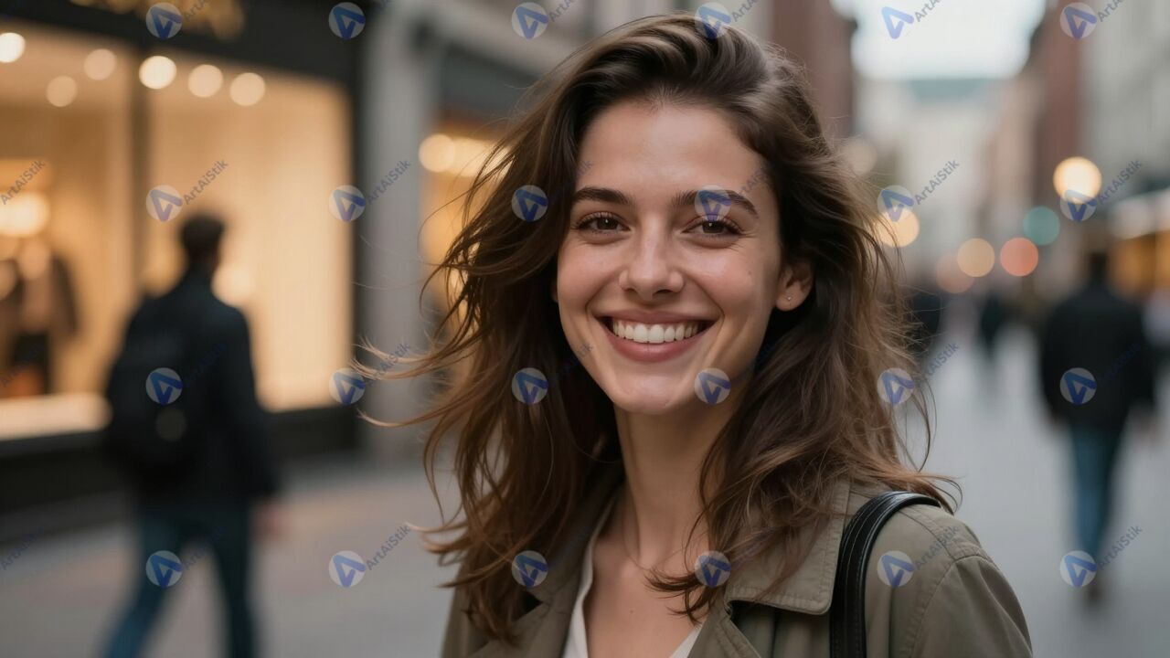 Портрет улыбающейся женщины демонстрирует открытую и тёплую эмоцию, когда она смотрит прямо в камеру на фоне мягко размытых огней вечернего города. Её лицо освещено естественным светом, который делает кожу живой и сияющей, а глаза яркими и выразительными, поэтому портрет улыбающейся женщины мгновенно привлекает внимание зрителя. Лёгкий ветер слегка развивает волосы, создавая ощущение движения и спонтанности, при этом поза остаётся расслабленной и уверенной. На заднем плане заметны силуэты прохожих и свет витрин, но они размыты и не отвлекают от главного объекта кадра. Цветовая палитра кадра тёплая, в ней преобладают золотистые и мягкие оранжевые оттенки, подчёркивающие чувство радости и лёгкости. Такое изображение может использоваться в рекламных материалах, редакционных историях о городской жизни, проектах о психологии и самооценке, а также в коллекциях стоковых портретов, где важна искренность и современный характер модели.