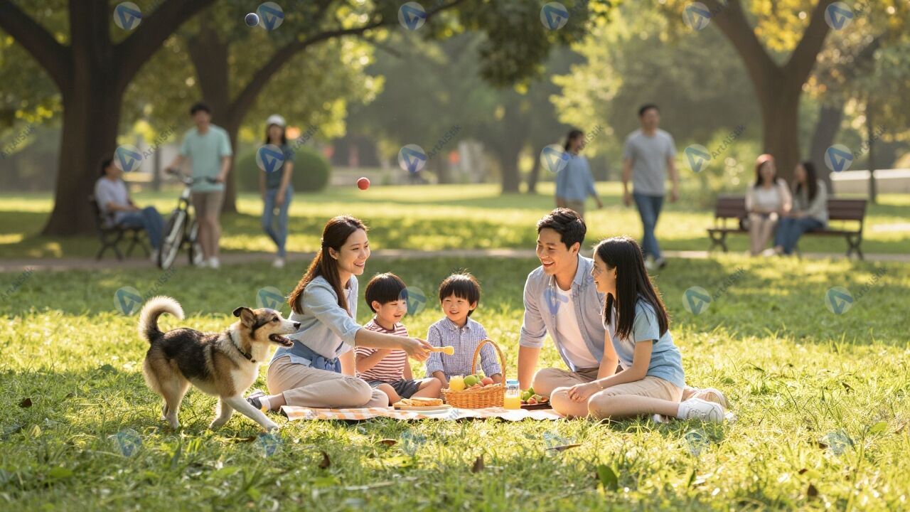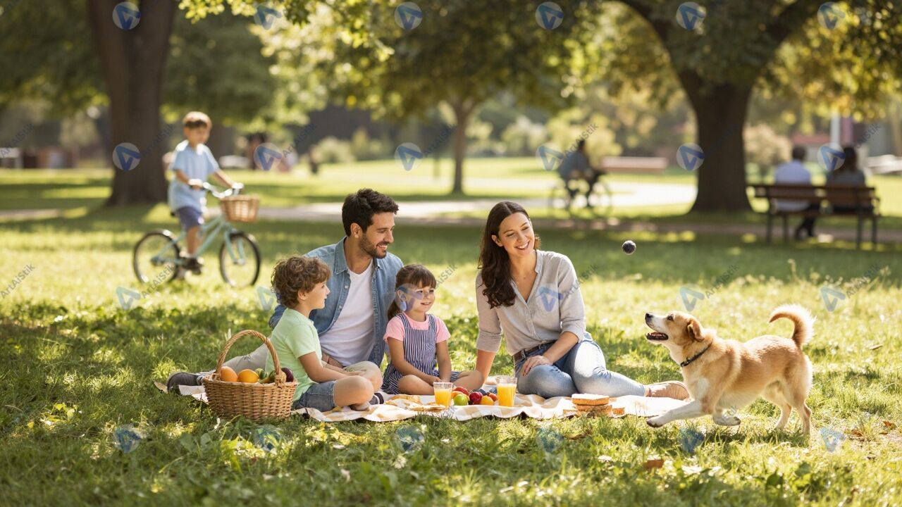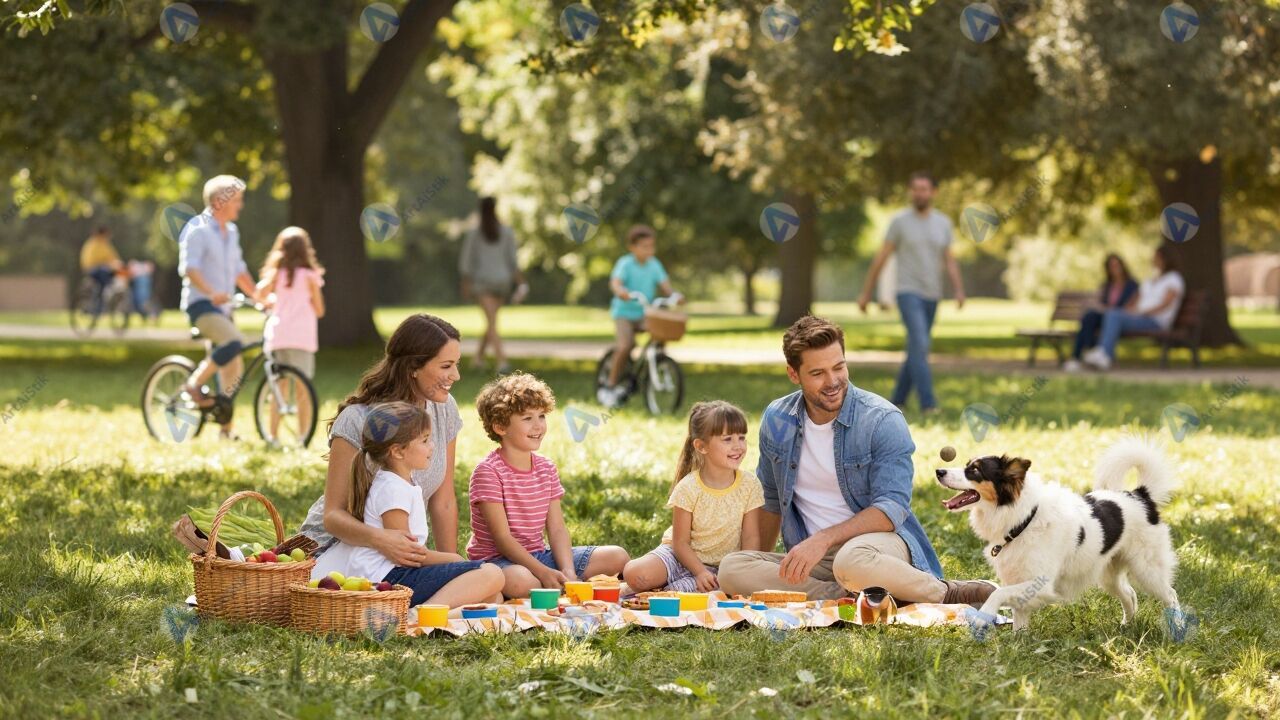 Семейный отдых на пикнике в парке с детьми и собакой разворачивается на зеленой лужайке под раскидистыми деревьями, через листву которых пробивается мягкий солнечный свет, создавая пятна света и тени на траве. В центре сцены расположено большое клетчатое одеяло, на котором сидят родители и дети, улыбаются, разговаривают и делятся едой из плетёной корзины, полной фруктов, бутербродов и напитков. Рядом весело бегает собака, подбрасывая в воздух мяч или палку, что добавляет динамику и ощущение радостного движения, характерного для семейных выходных. На заднем плане видны другие люди, гуляющие по парку, катающиеся на велосипедах или сидящие на скамейках, однако они изображены размыто, чтобы не отвлекать внимание от главных персонажей. Цветовая палитра тёплая и жизнерадостная, с преобладанием зелёных оттенков травы и листвы, ярких тонов одежды и деталей пикника, что создаёт атмосферу счастья, уюта и гармонии. Стиль изображения реалистичный или близкий к фотографическому, с мягким боке на фоне, что делает сцену подходящей для использования в рекламных материалах, посвящённых семейным товарам, страхованию, детским товарам и услугам для активного отдыха. Композиция выстроена так, чтобы передать непосредственность и искренность эмоций, при этом оставляя свободное пространство для размещения слоганов, логотипов и информационных блоков. Такое изображение идеально подойдёт для лендингов о загородных клубах, семейных фестивалях, блогов о родительстве и визуального сопровождения статей о балансе работы и личной жизни.