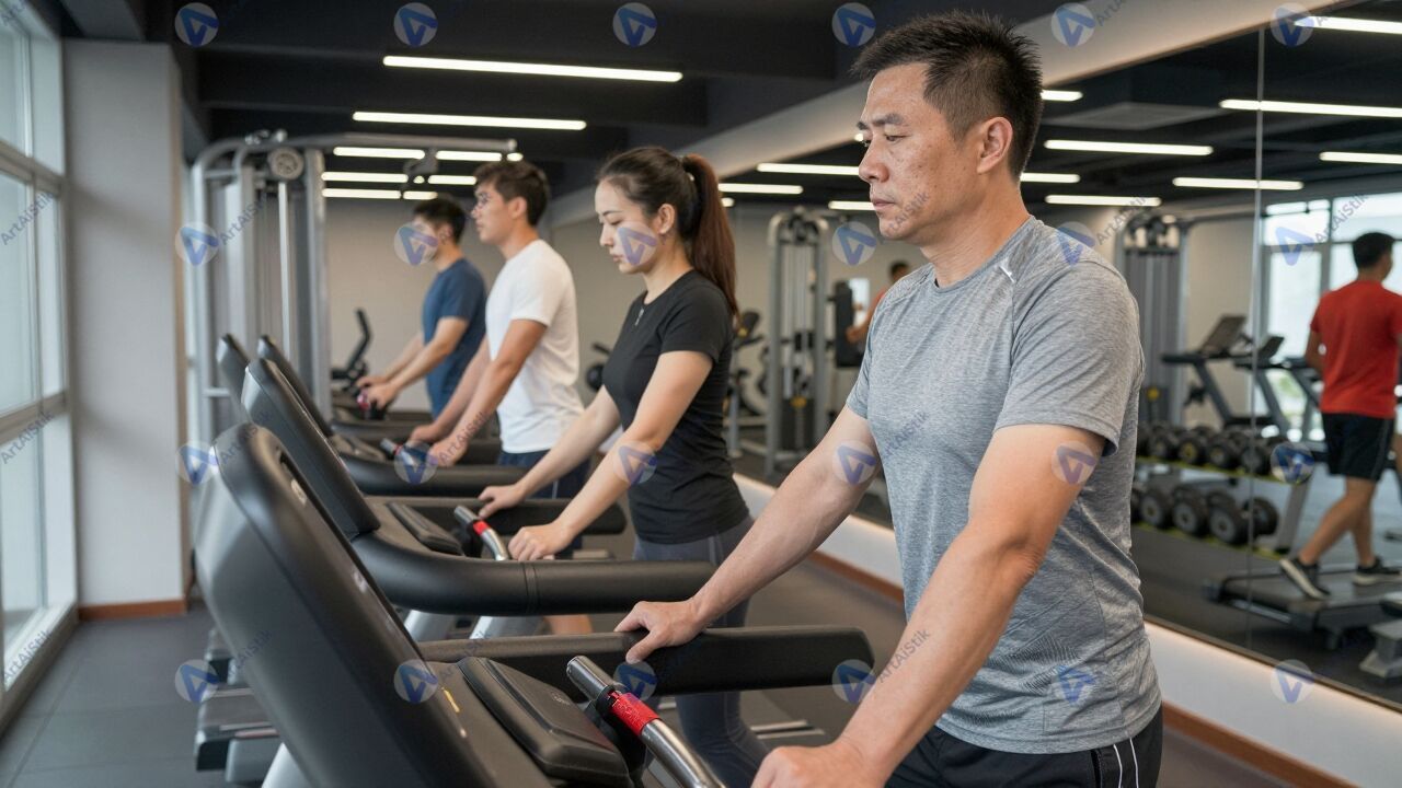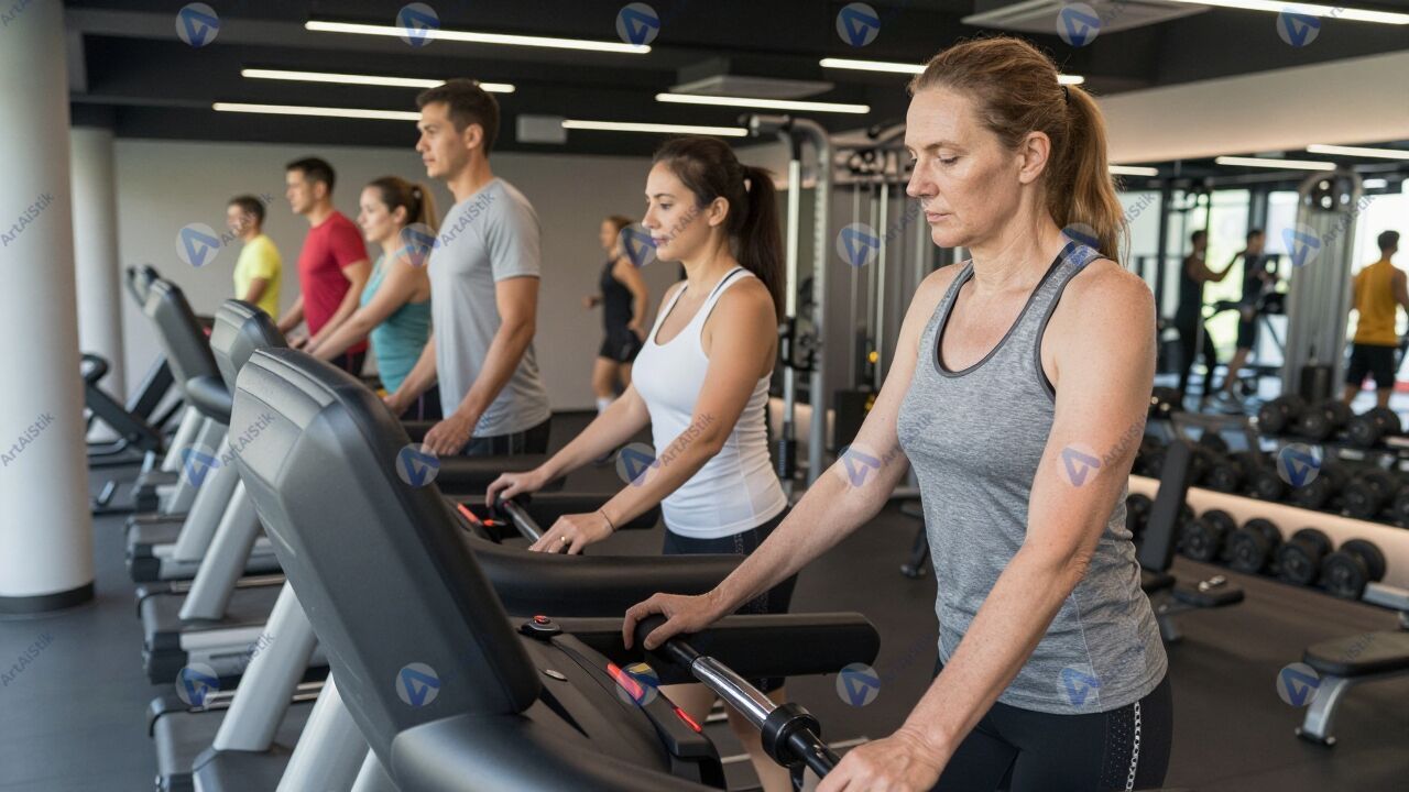 Спортзал тренировка фитнес показывает ряд беговых дорожек, на которых люди разного возраста и уровня подготовки занимаются кардио‑нагрузкой. Зеркальная стена отражает движения и помогает посетителям контролировать технику, а яркий искусственный свет подчёркивает чистоту пространства и оборудование. На заднем плане видны силовые тренажёры, стойки с гантелями и зоны растяжки, поэтому спортзал тренировка фитнес выглядит универсальным местом для поддержания формы. Люди одеты в удобную спортивную одежду, на их лицах заметна концентрация и лёгкая усталость, что делает сцену правдоподобной и мотивирующей. Такое изображение подойдёт для рекламных кампаний фитнес‑клубов, приложений для тренировок, статей о здоровом образе жизни и визуальных материалов, посвящённых движению и дисциплине.