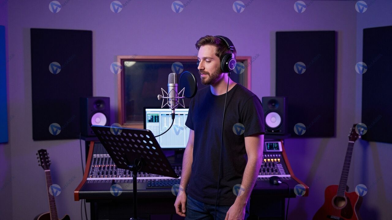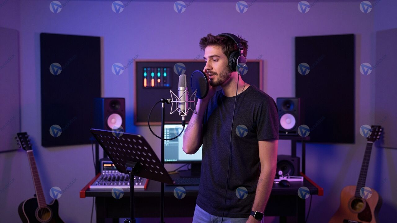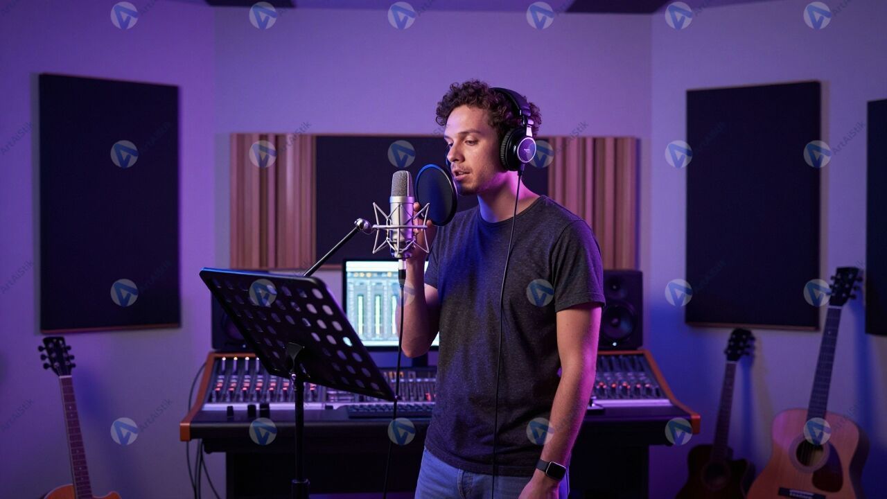 Творческая музыка студия наполнена мягким неоновым светом, который окрашивает стены в фиолетовые и синие оттенки и создаёт атмосферу вдохновения. В центре кадра музыкант стоит у микрофона с наушниками на голове, внимательно слушает звучание и подпевает следующую строку, а творческая музыка студия подчёркивает его сосредоточенность и эмоции. На заднем плане виден пульт звукорежиссёра, мониторы и панели с индикаторами уровня сигнала, что добавляет технических деталей. Кабели аккуратно уложены, инструменты стоят на подставках, и пространство кажется одновременно рабочим и уютным. Такое изображение отлично подойдёт для проектов, связанных с записью музыки, подкастов, рекламой аудиооборудования и историй о творческом процессе.
