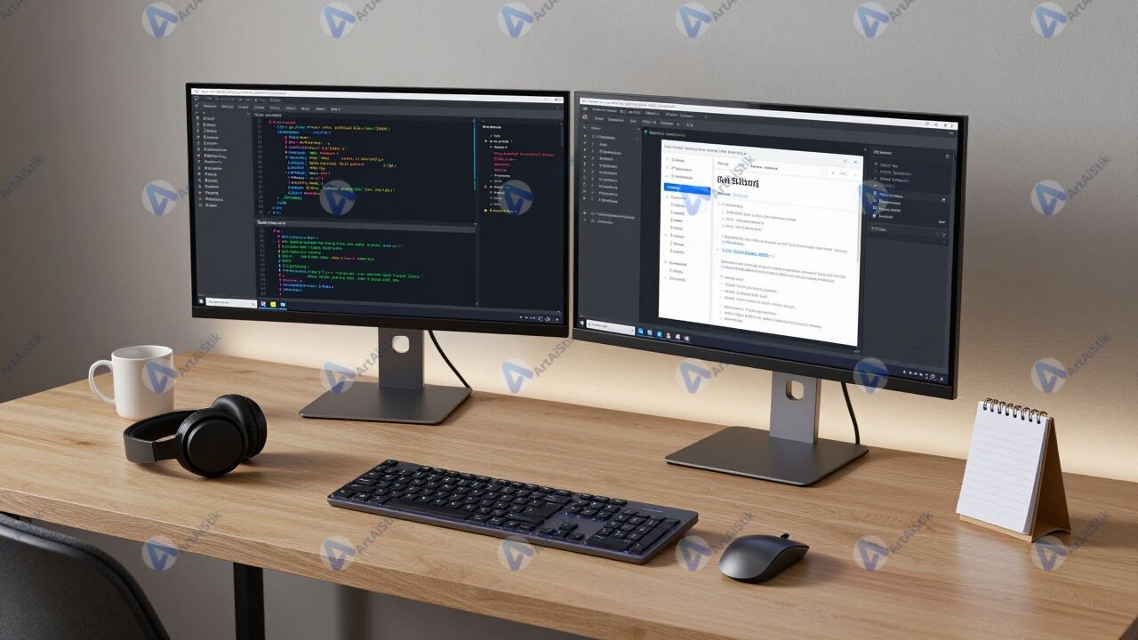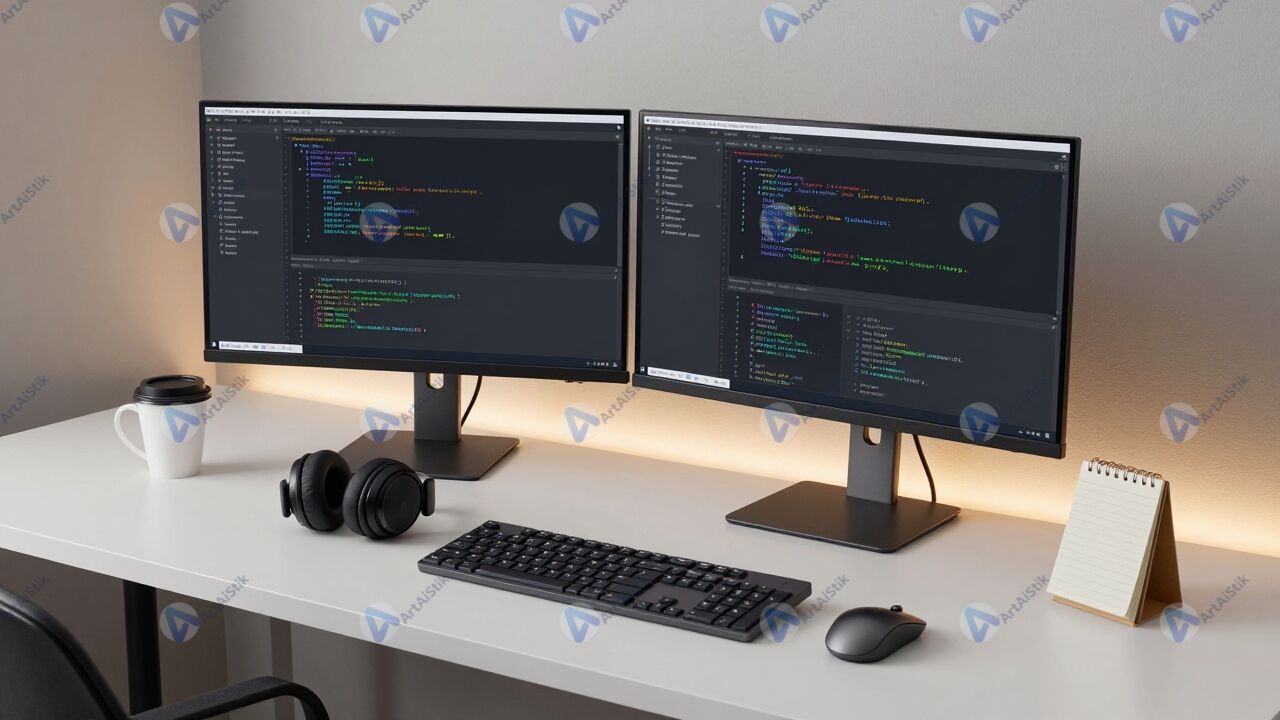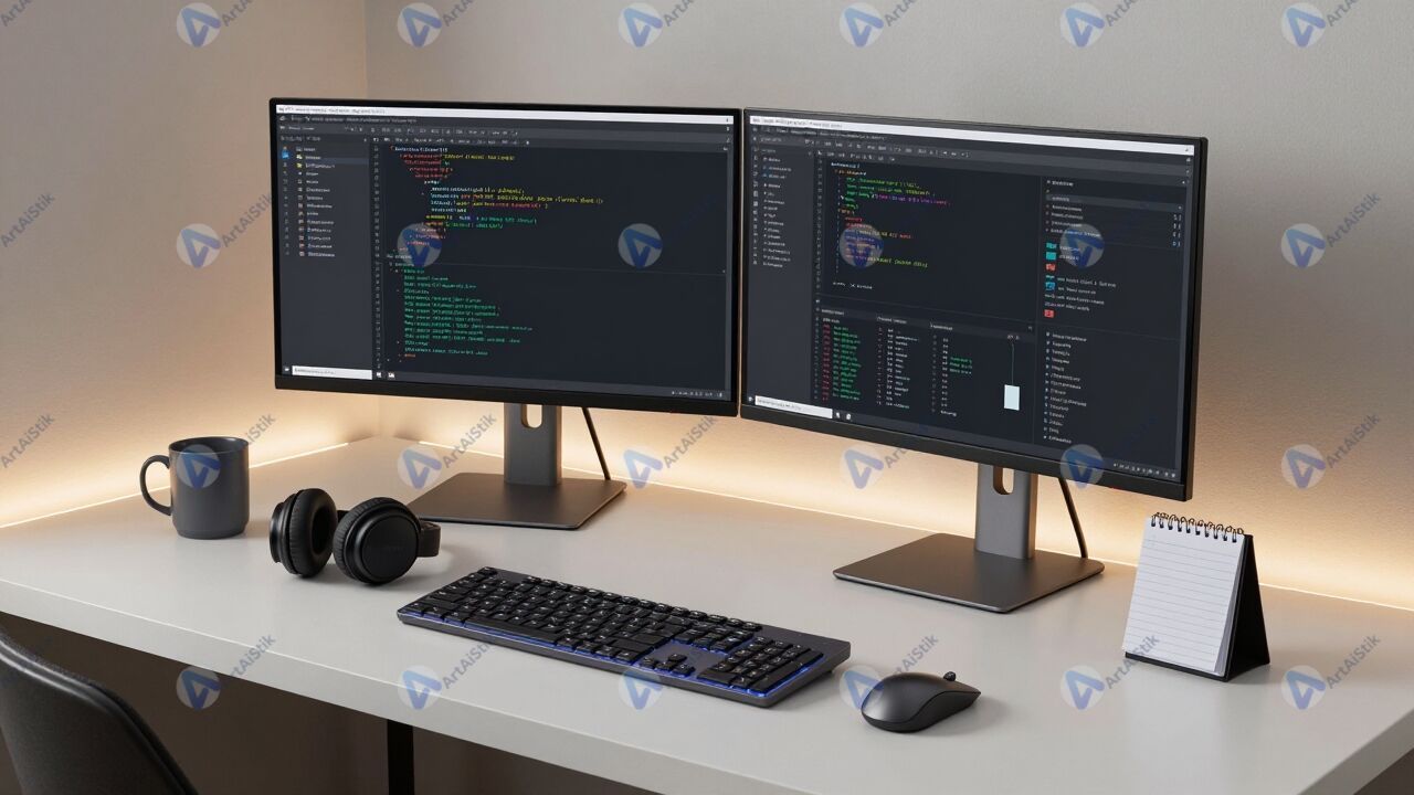Технологичный рабочий стол программиста представляет собой аккуратно организованное пространство с двумя мониторами, на которых открыты окна кода и графики. Клавиатура с подсветкой, современная мышь и наушники лежат на столе, а технологичный рабочий стол программиста подчёркивает внимание к деталям и продуктивную атмосферу. На заднем плане видны элементы светодиодной подсветки, создающие мягкое свечение по краям стола и стены. Рядом может стоять кружка с кофе и небольшой блокнот для быстрых записей. Такая композиция подойдёт для статей о разработке программного обеспечения, рекламных материалов IT‑компаний, страниц вакансий и блогов о продуктивности, где технологичный рабочий стол программиста становится символом современной цифровой работы.