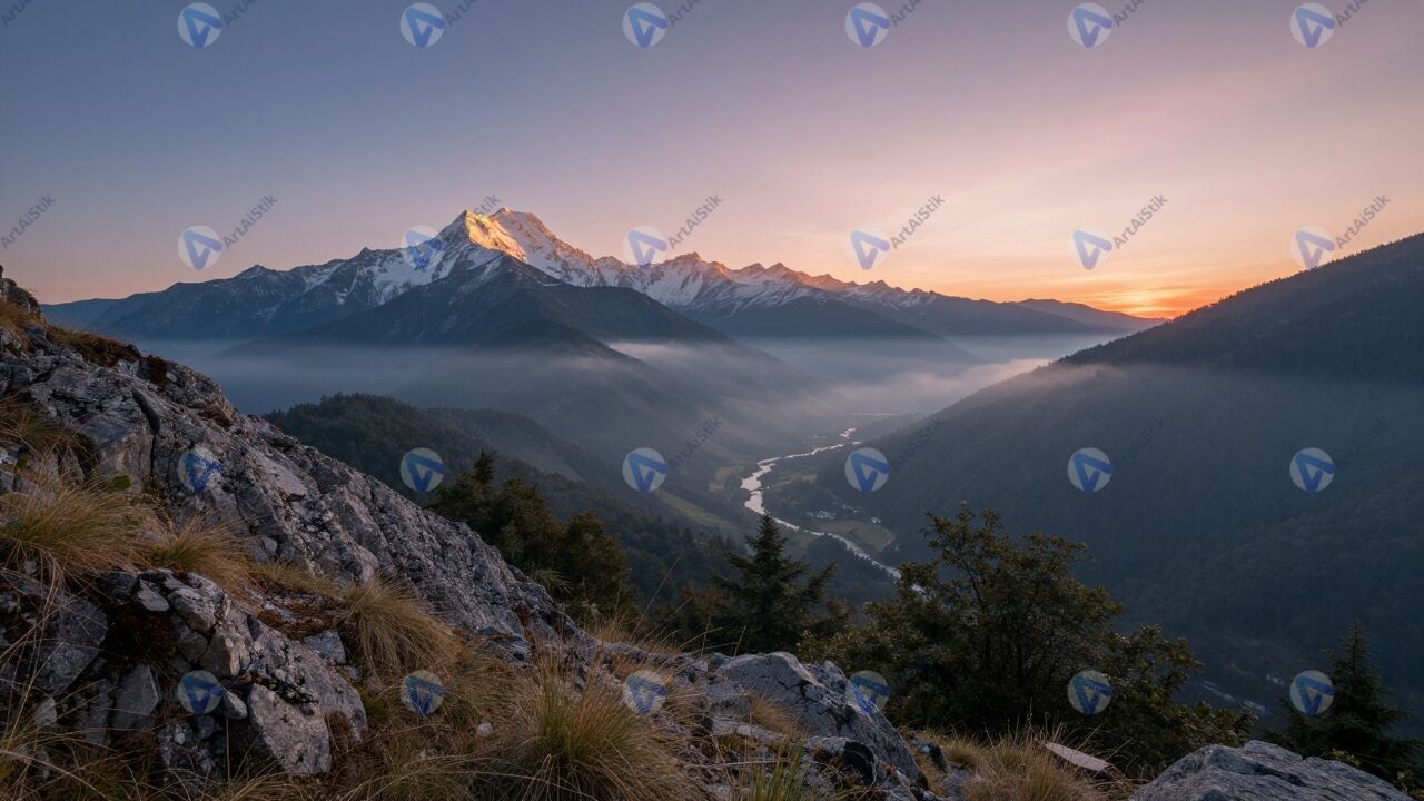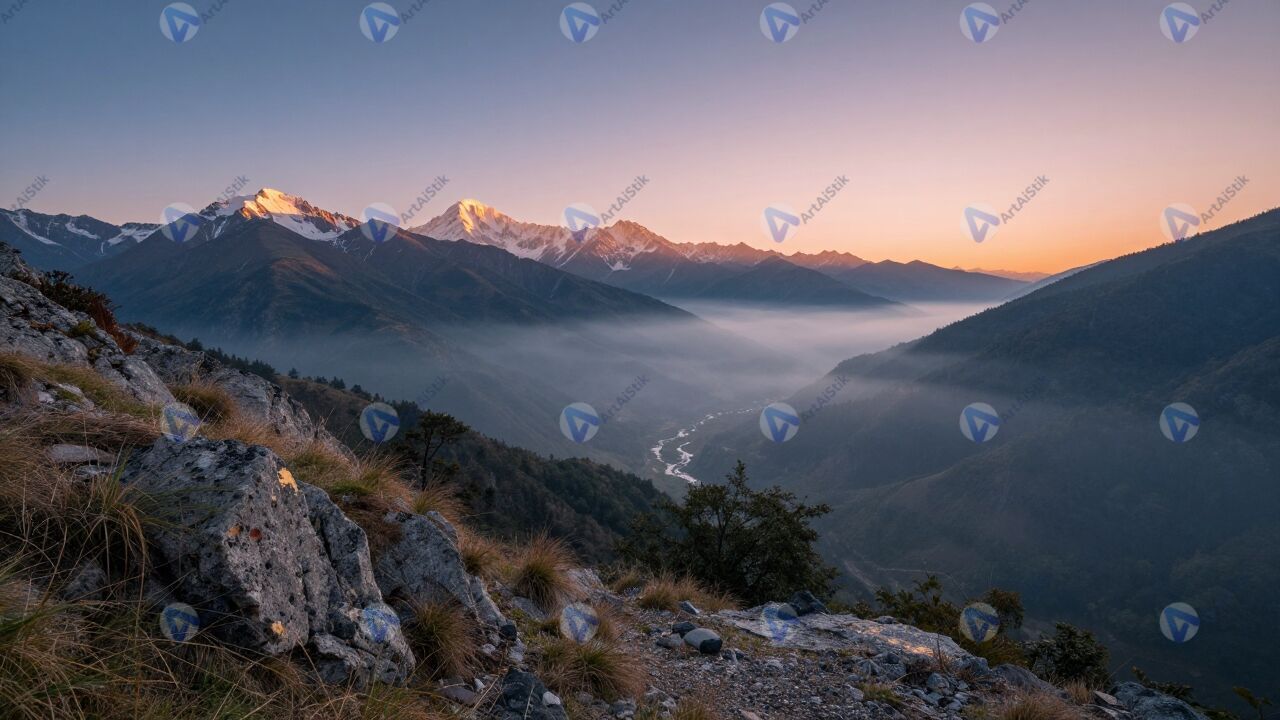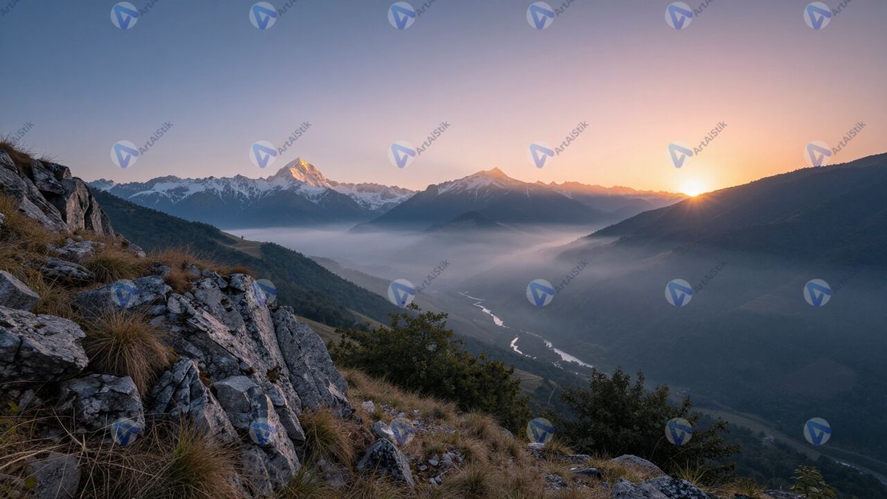 Утренний горный пейзаж раскрывается через вид с высоты, где на переднем плане лежит каменистый склон с редкими травами и низкими кустарниками. Ниже простирается долина, затянутая лёгким туманом, который мягко скрывает детали леса и рек, а утренний горный пейзаж кажется почти нереальным и сказочным. Первые лучи солнца подсвечивают вершины вдали, создавая золотистый ореол вокруг заснеженных пиков и подчёркивая их величие. Небо плавно переходит от холодных синих оттенков к тёплым розовым и оранжевым цветам, что добавляет сцене динамики и контраста. Такой кадр отлично подходит для туристических и мотивационных проектов, связанных с путешествиями, преодолением сложностей и вдохновением на новые цели.