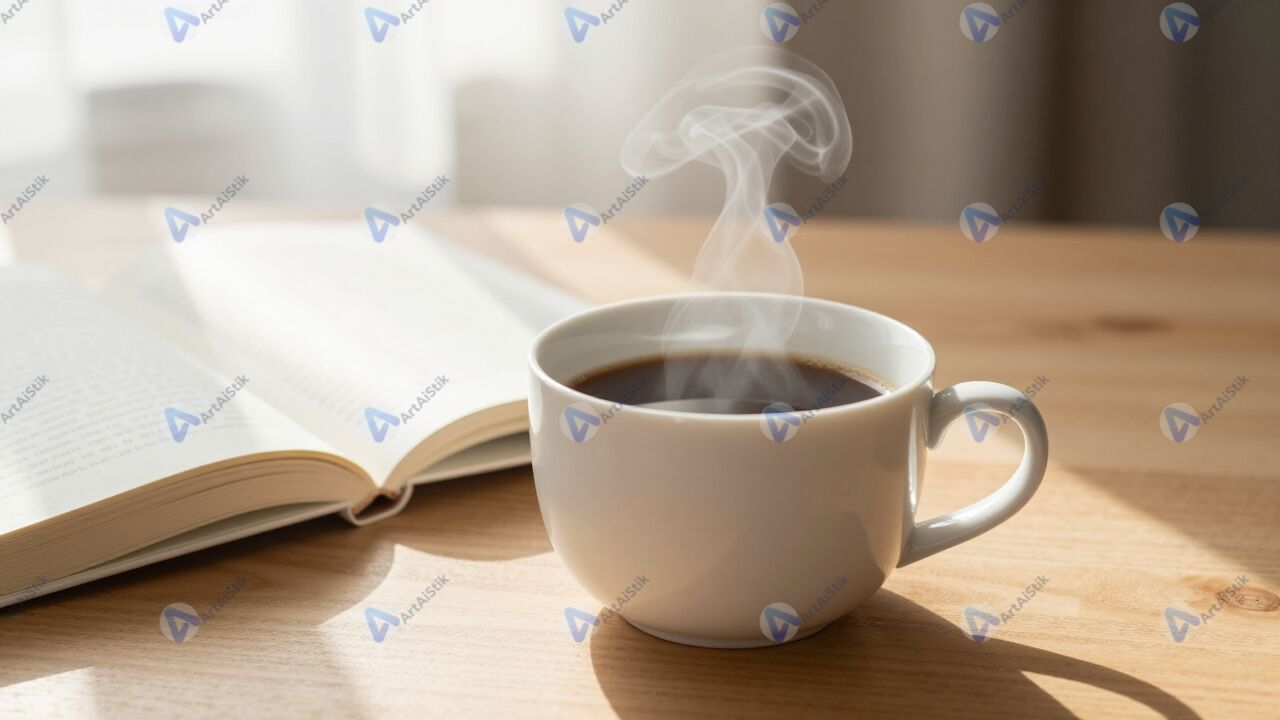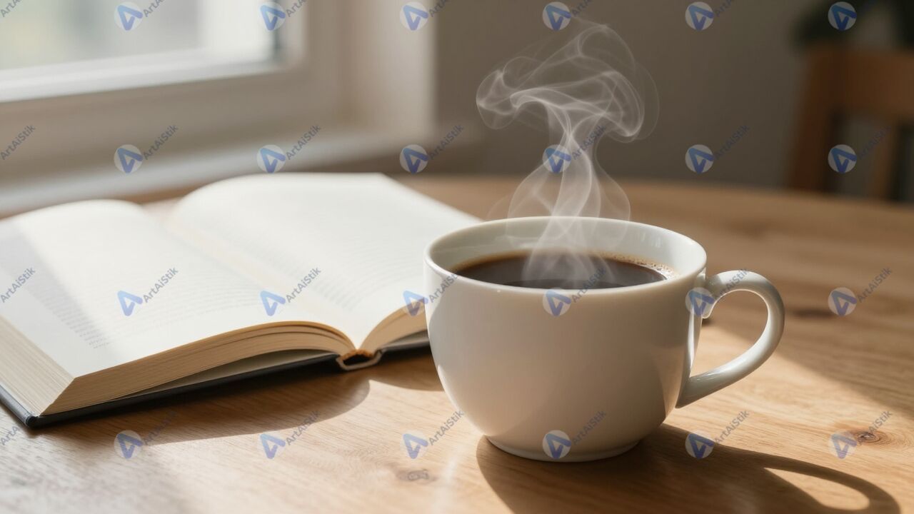 Белая чашка с дымящимся кофе на деревянном столе, рядом лежит книга, мягкий утренний свет, уютная атмосфера, начало дня, спокойствие