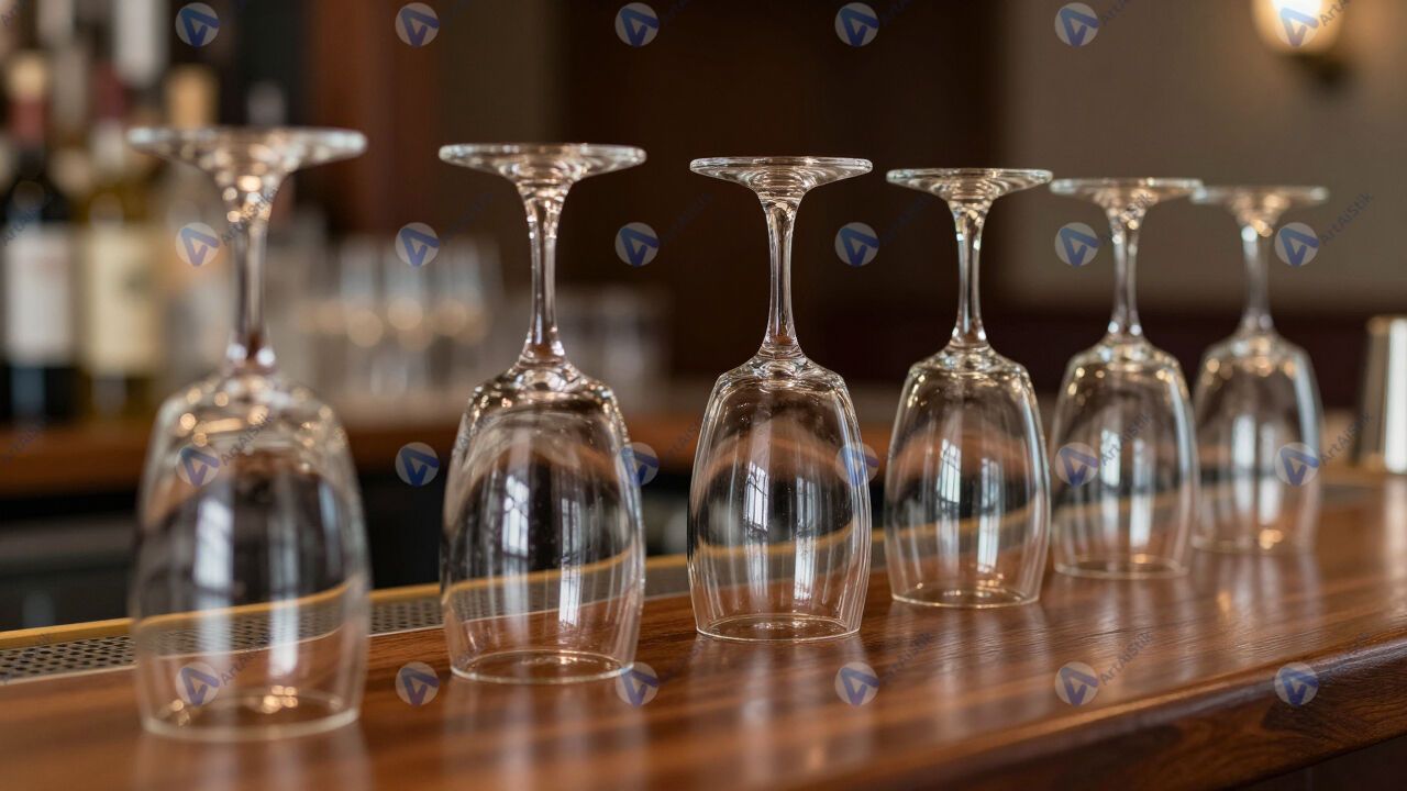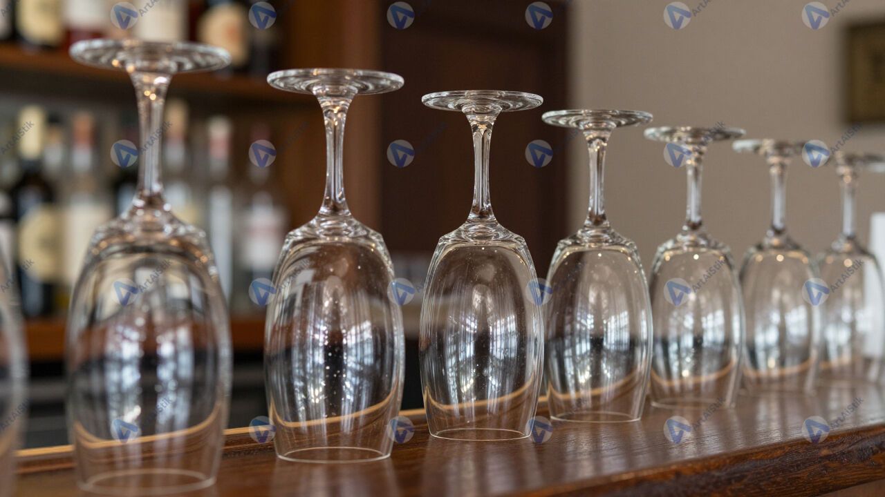 Барная стойка с линией одинаковых бокалов вверх дном.