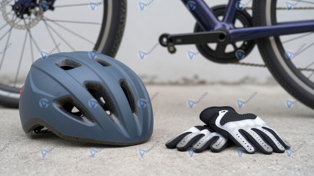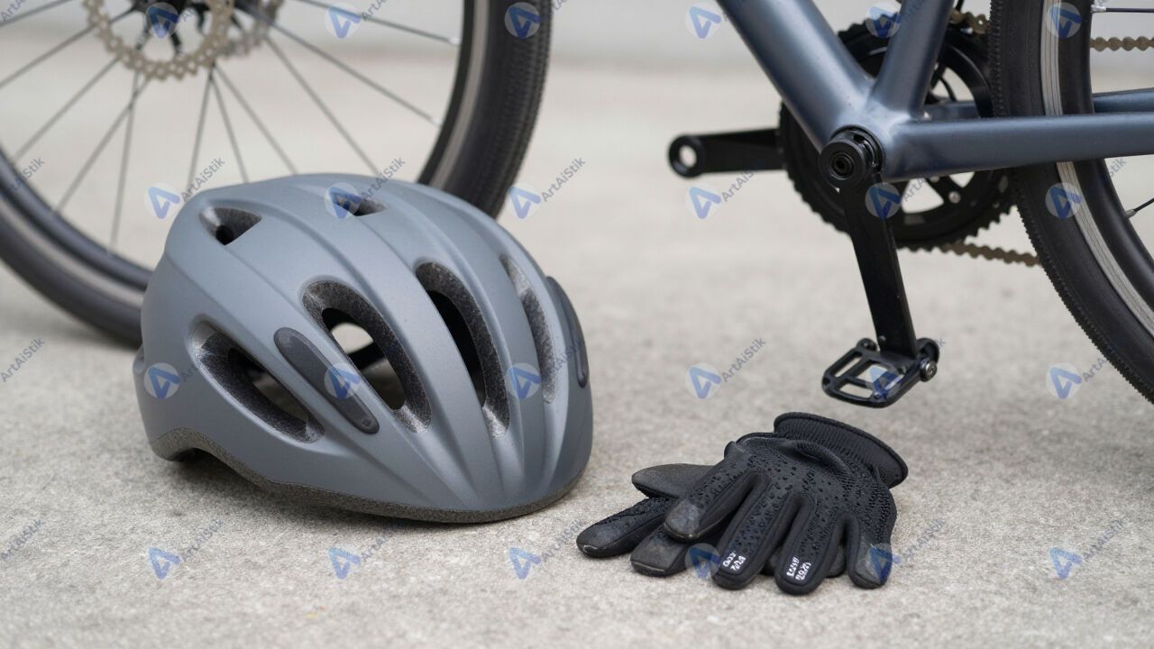 Велосипедный шлем и перчатки лежат рядом с рамой велосипеда.
