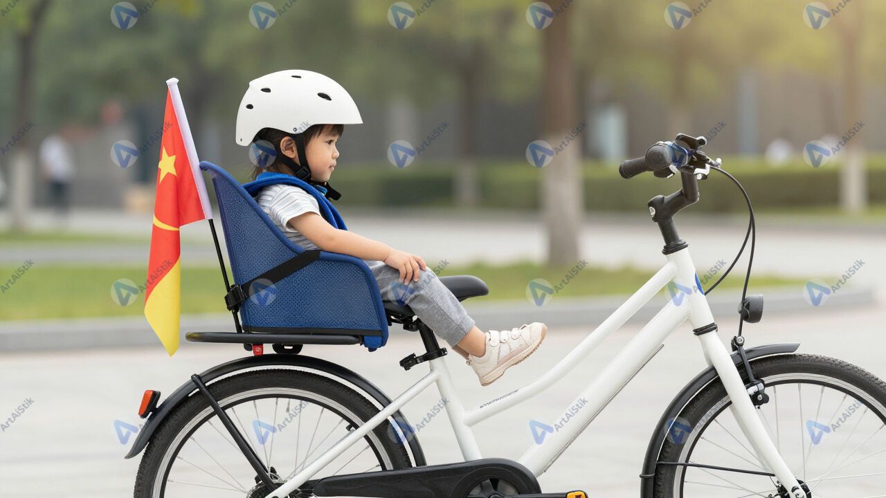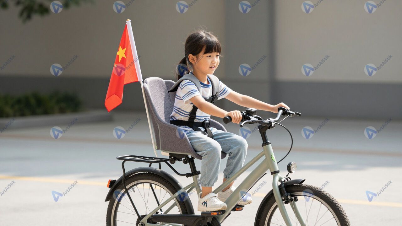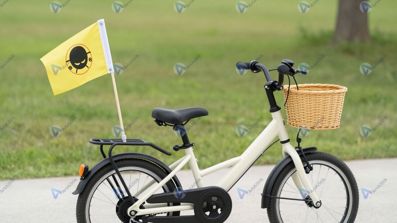 Велосипед с установленным детским флажком безопасности.