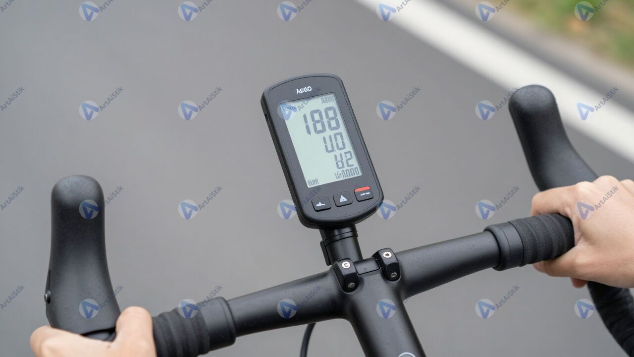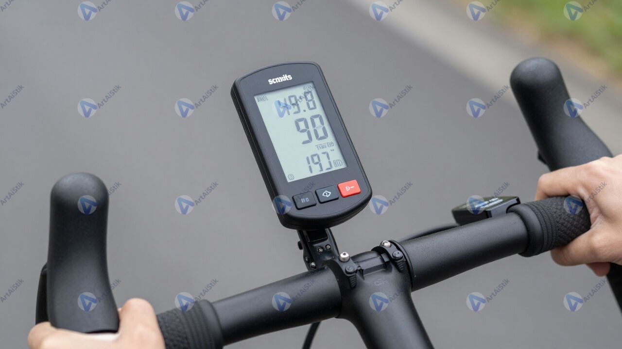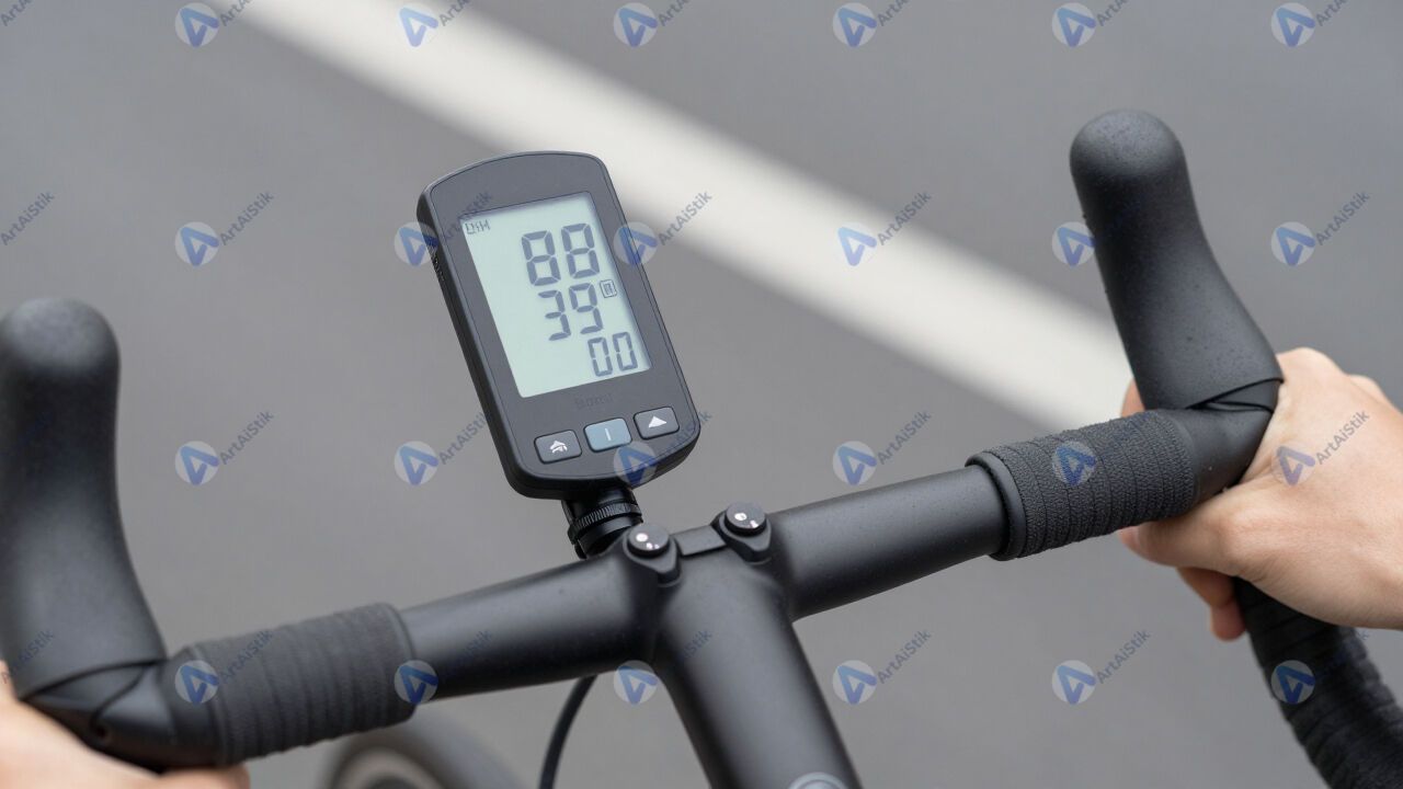 Велосипедный компьютер на руле показывает скорость и расстояние.
