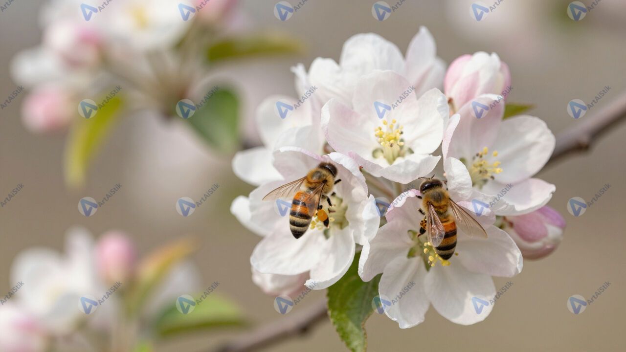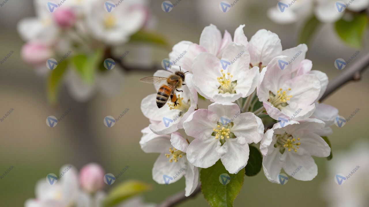 Цветущая яблоня, бело-розовые цветы, пчёлы.