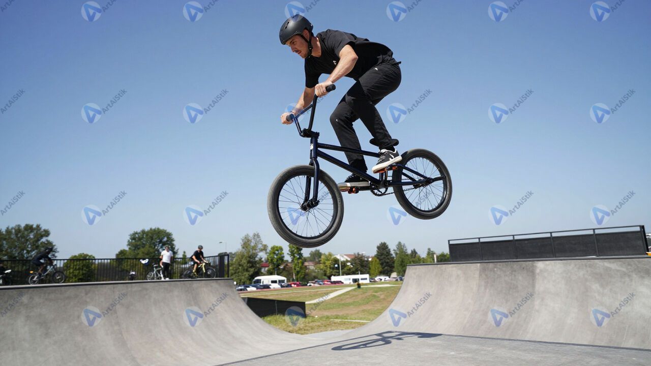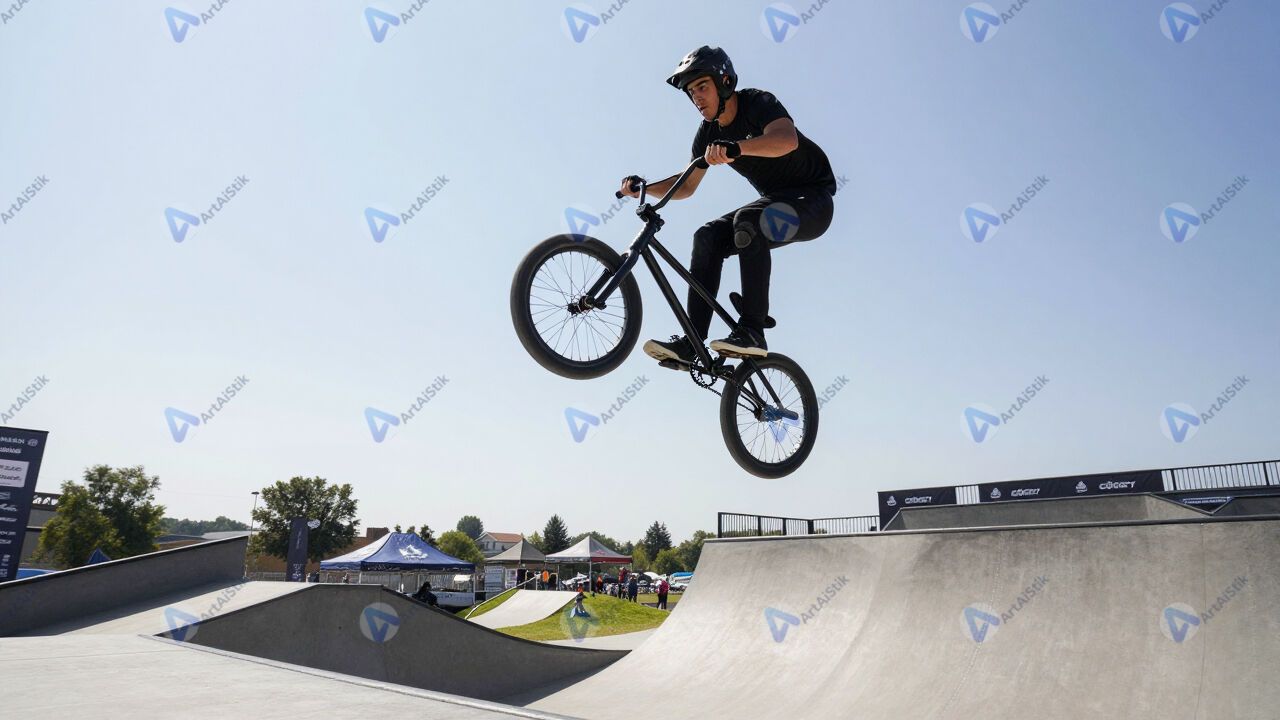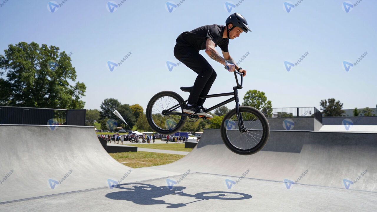 BMX‑райдер крутит барспин над рампой.