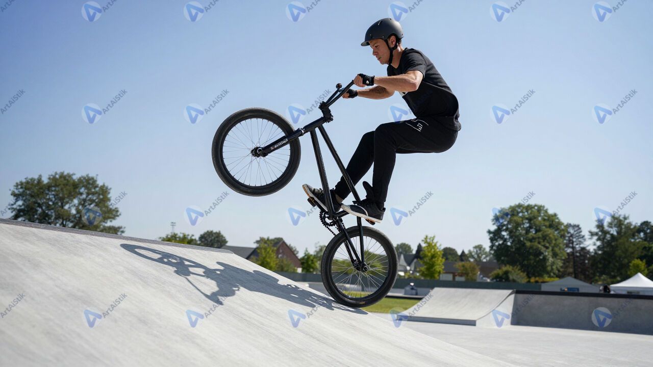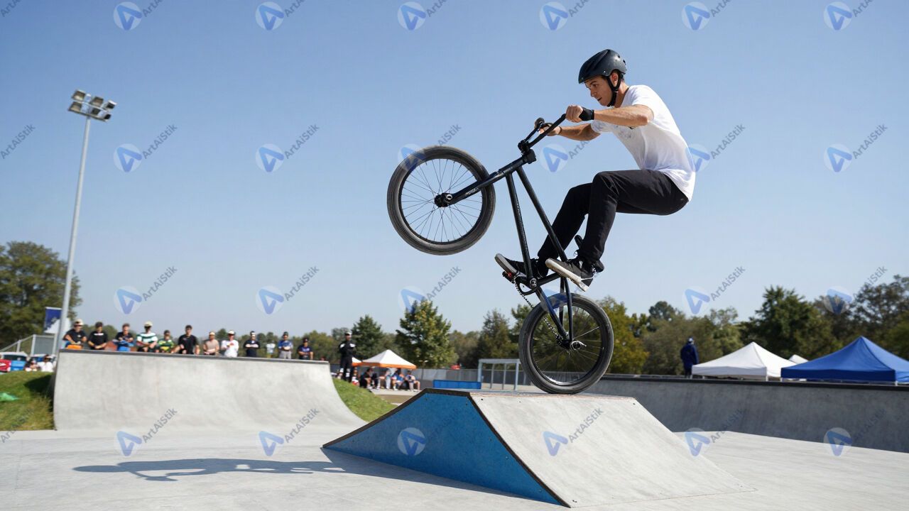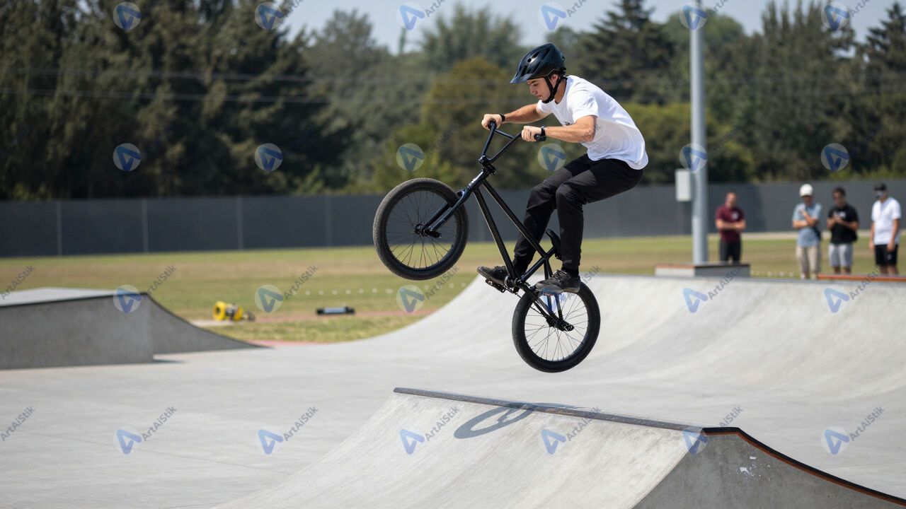 BMX‑райдер крутит «tailwhip» над трамплином.