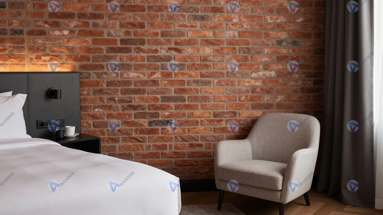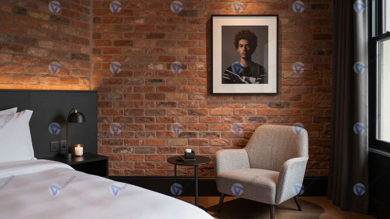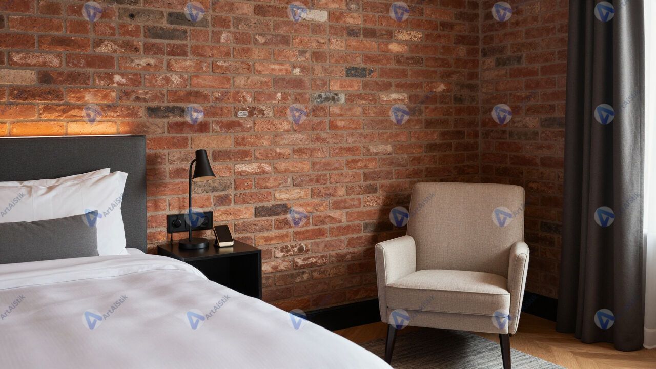 Номер в бутик‑отеле с кирпичной стеной и дизайнерским креслом.