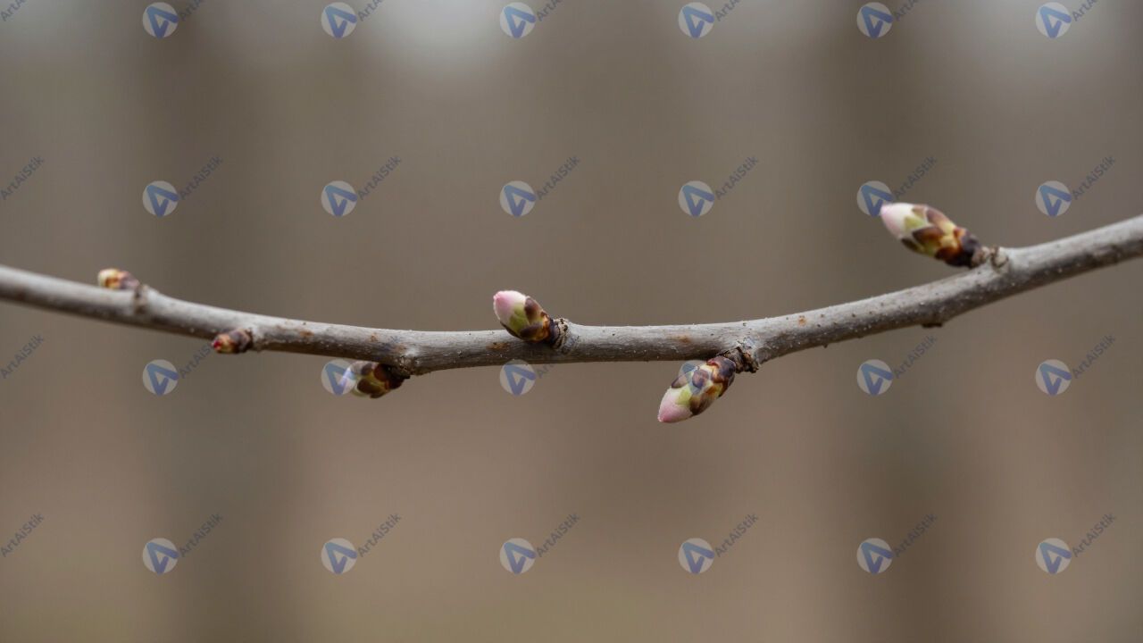 Ветка с почками весной, крупный план, размытый лес.
