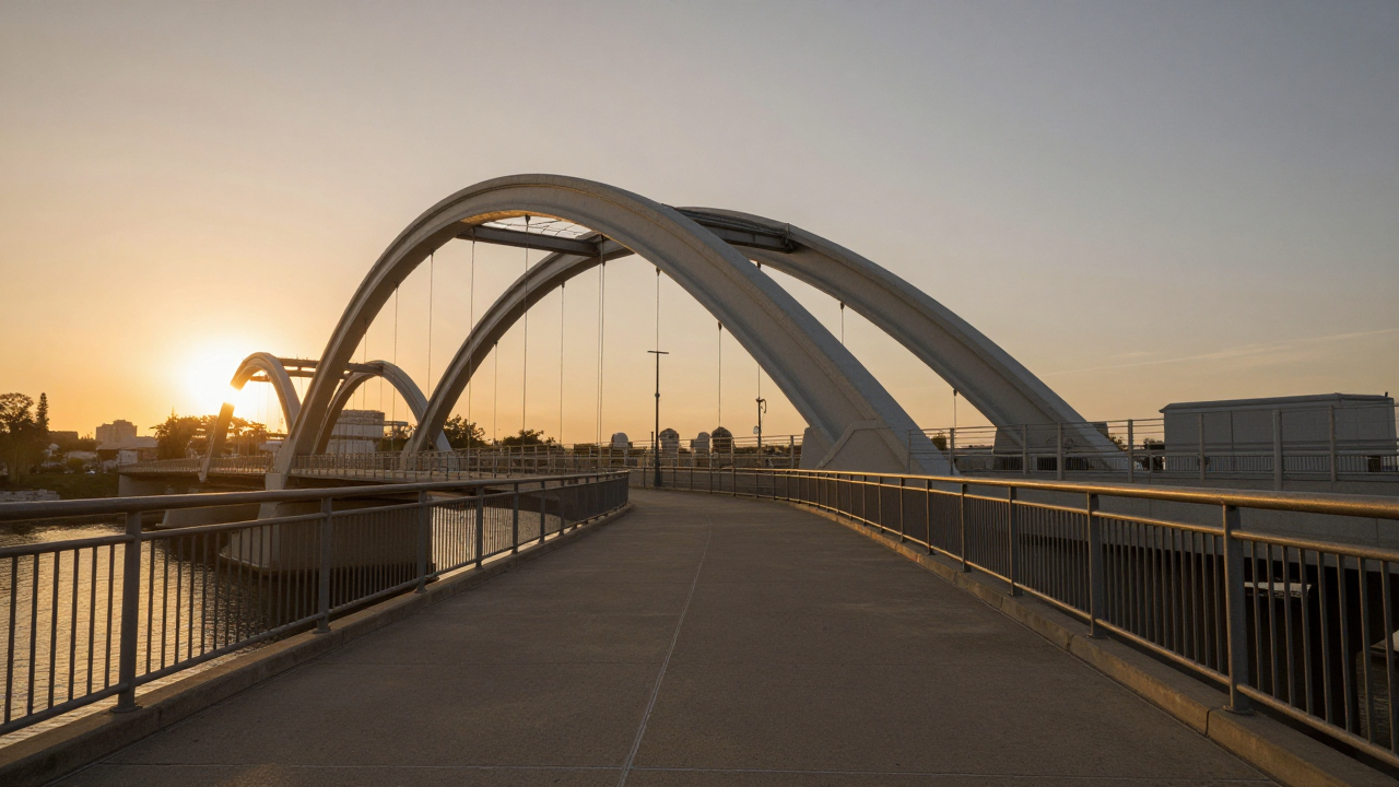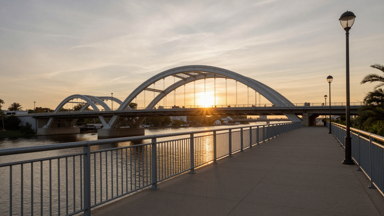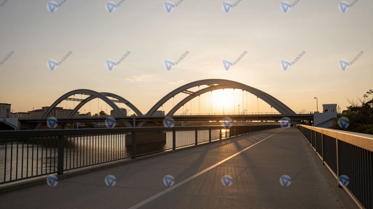 Мост с арками и пешеходной дорожкой сбоку, закат.