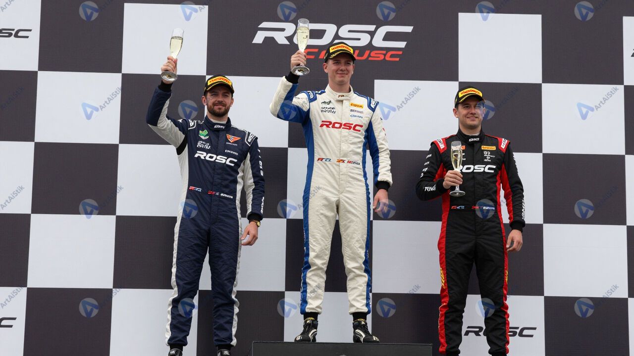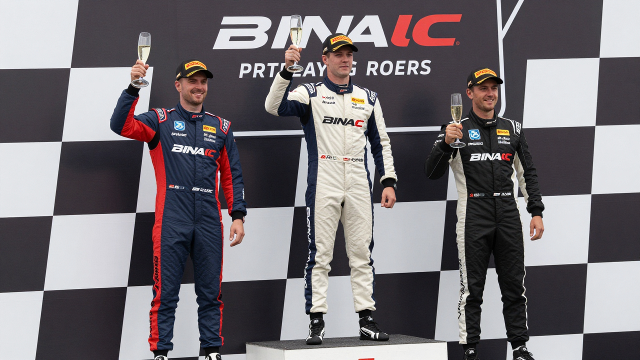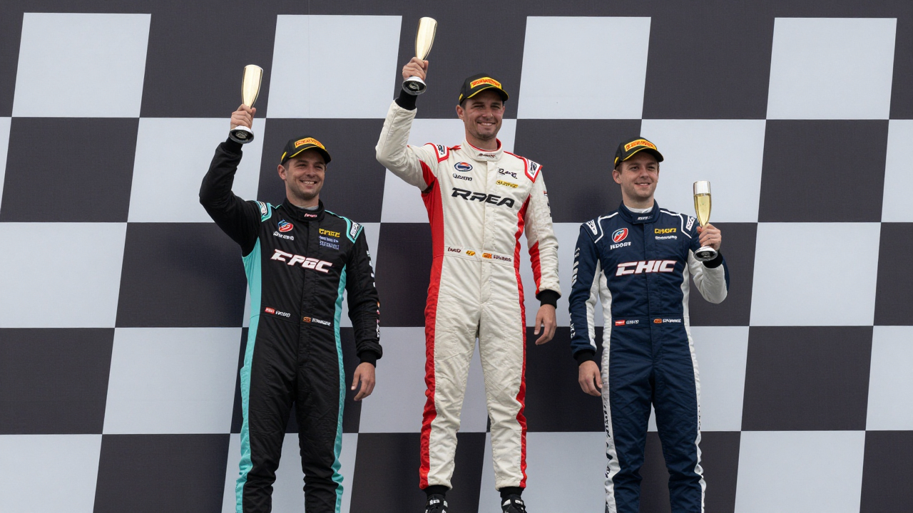 Подиум автогонки, пилоты в гоночных костюмах с шампанским.