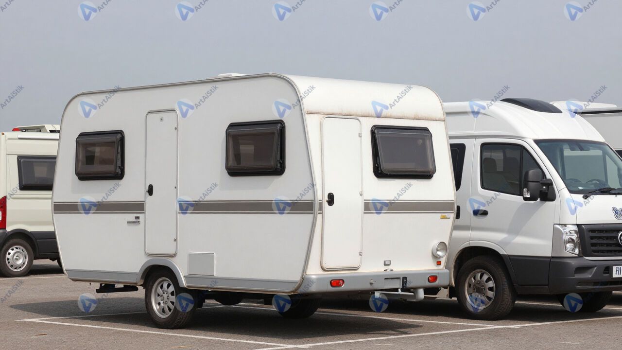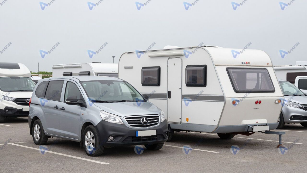 Автомобиль с прицепом‑дачей на парковке лагеря.