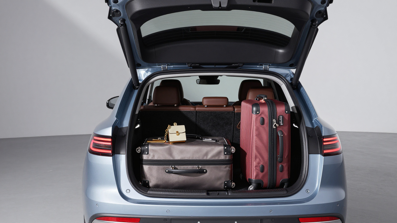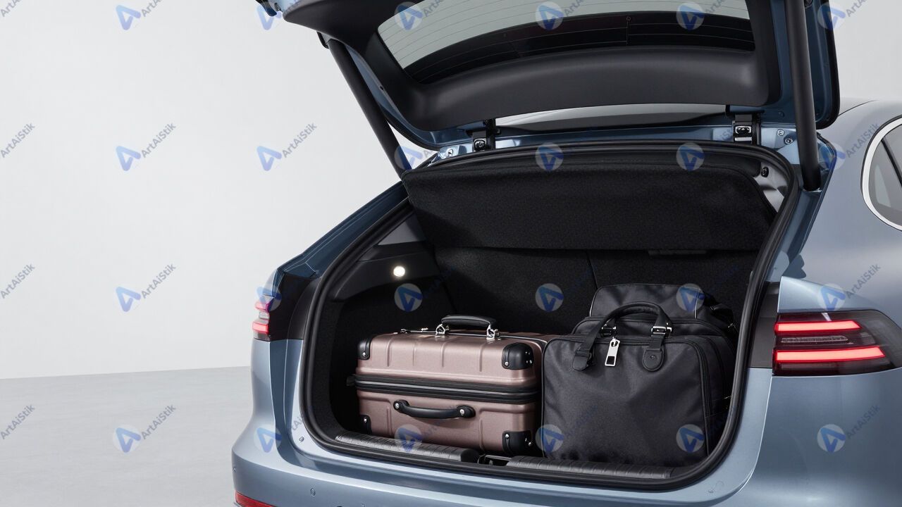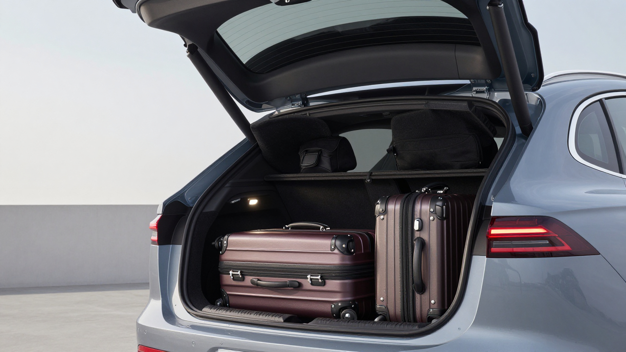 Автомобиль с открытым багажником, внутри чемоданы и сумки.