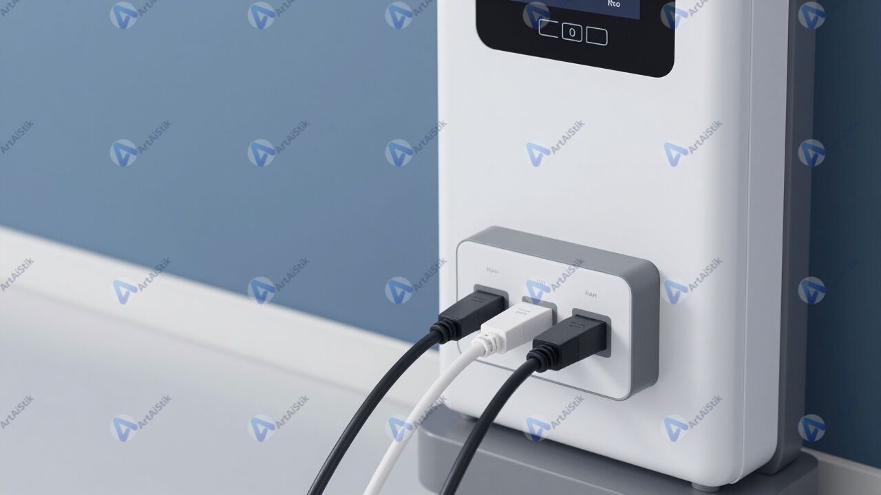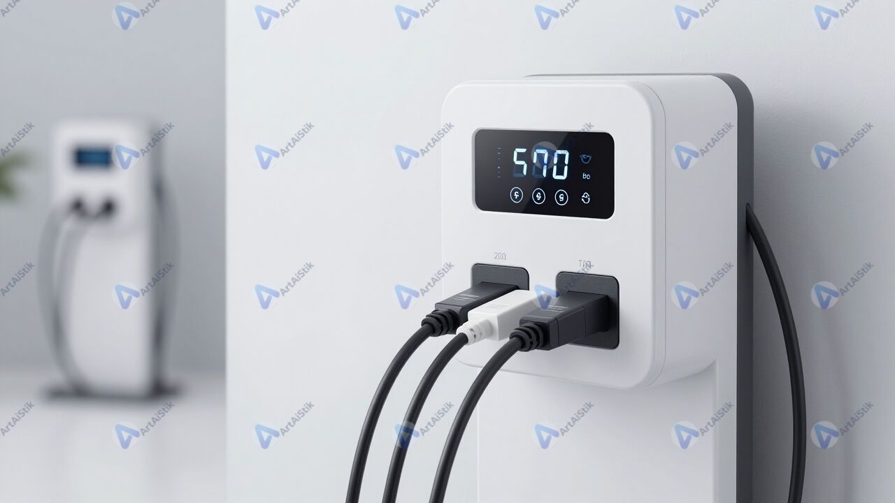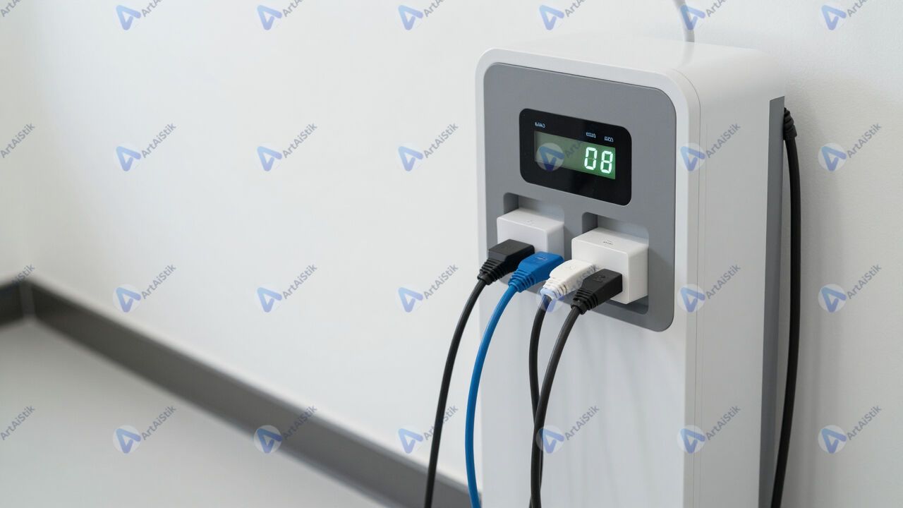 Зарядная станция с несколькими кабелями и подключёнными устройствами.