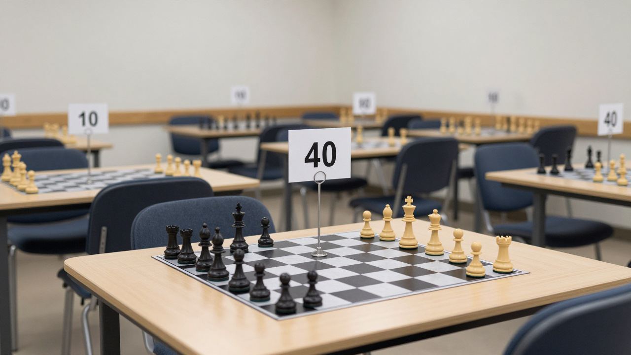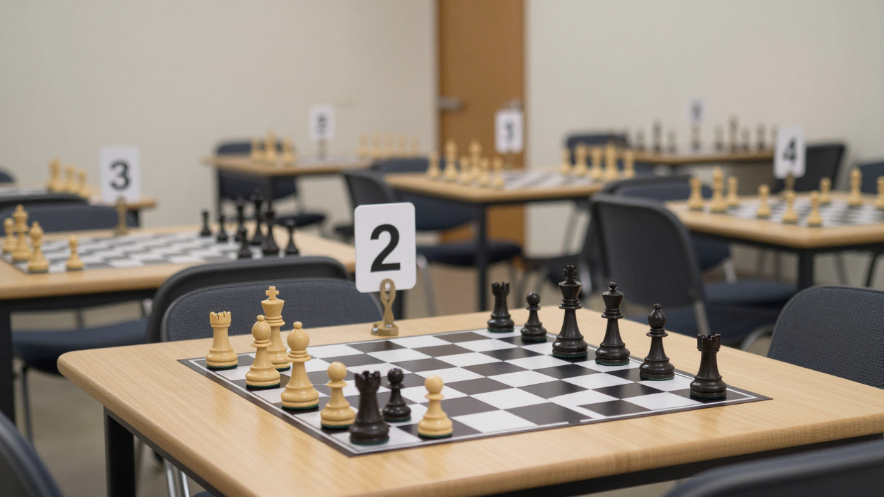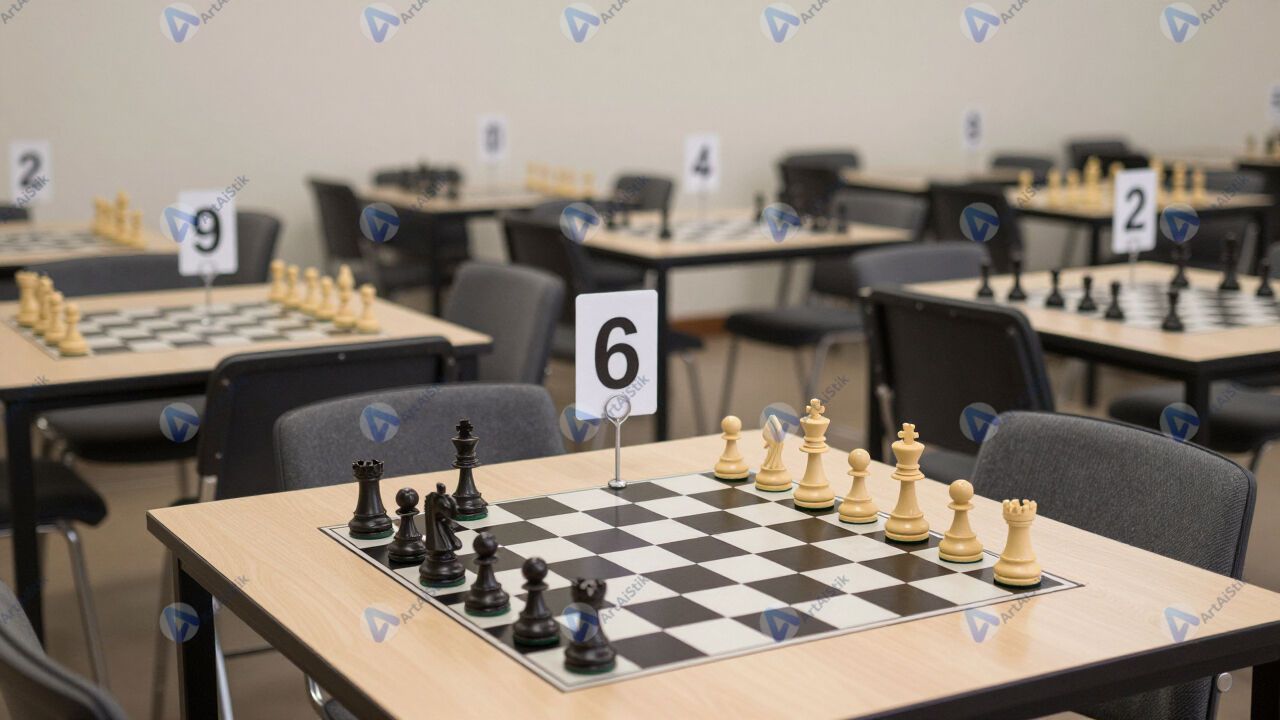Шахматный зал с множеством столов, над каждым табличка с номером.