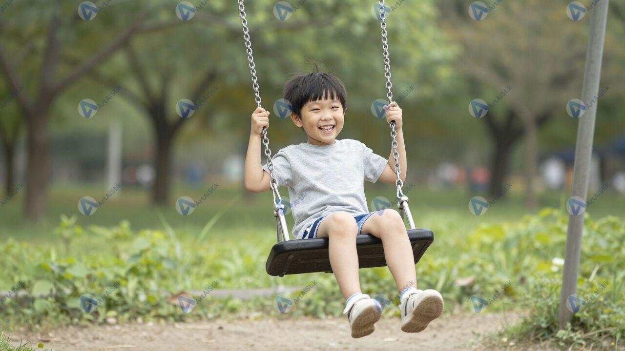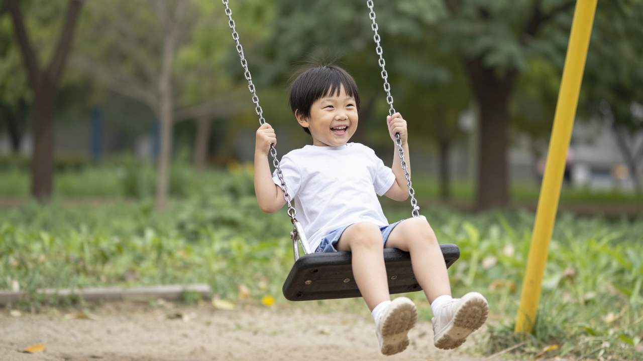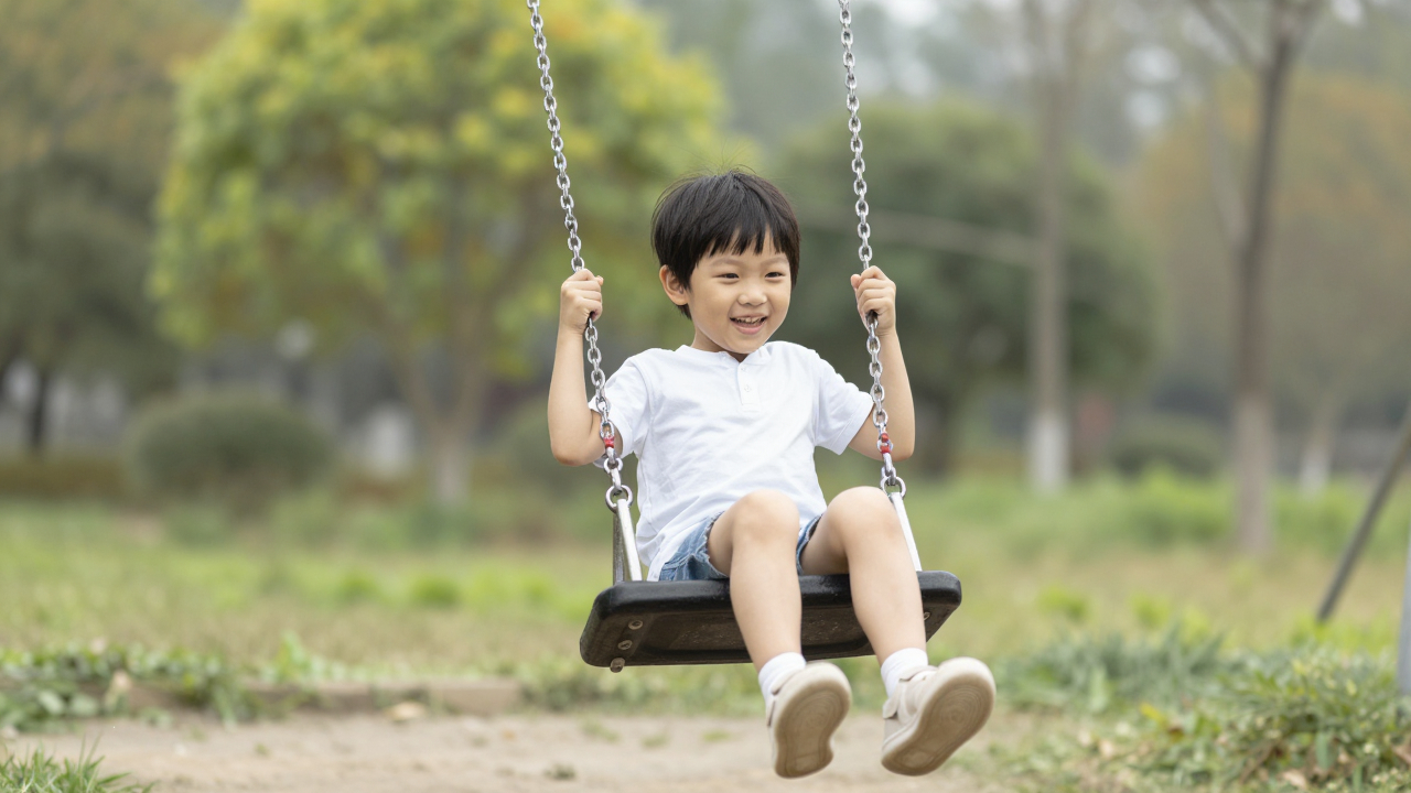 Ребёнок на качелях, парк, радость.