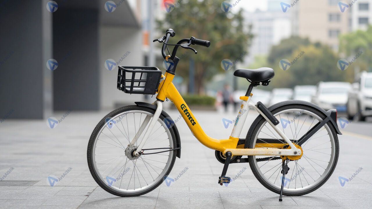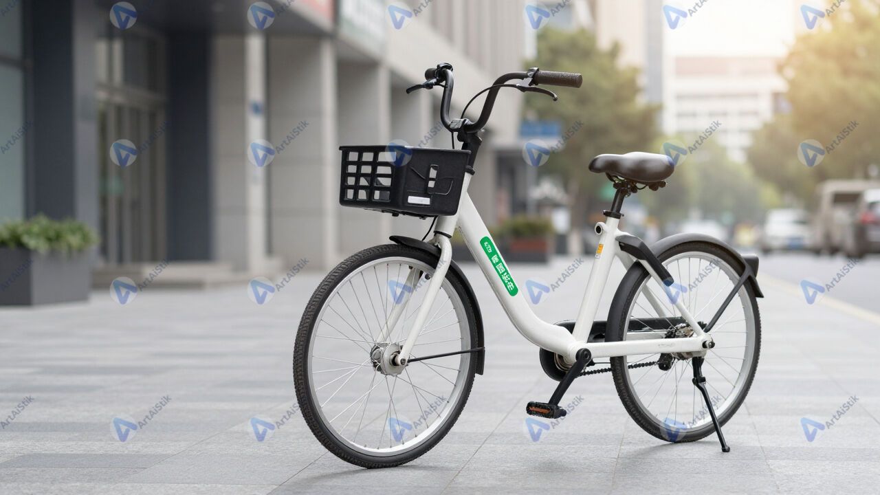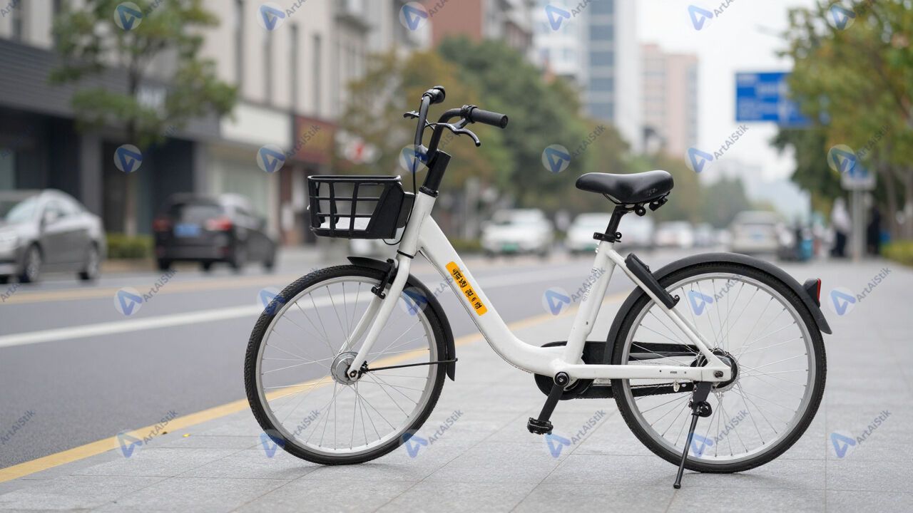 Городской прокатный велосипед в стойке с логотипом сервиса.
