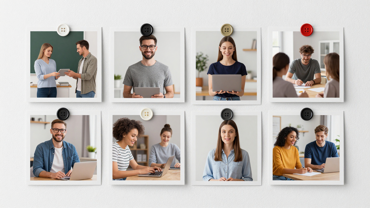 Коллаж из нескольких фотографий на стене, закреплённых кнопками.