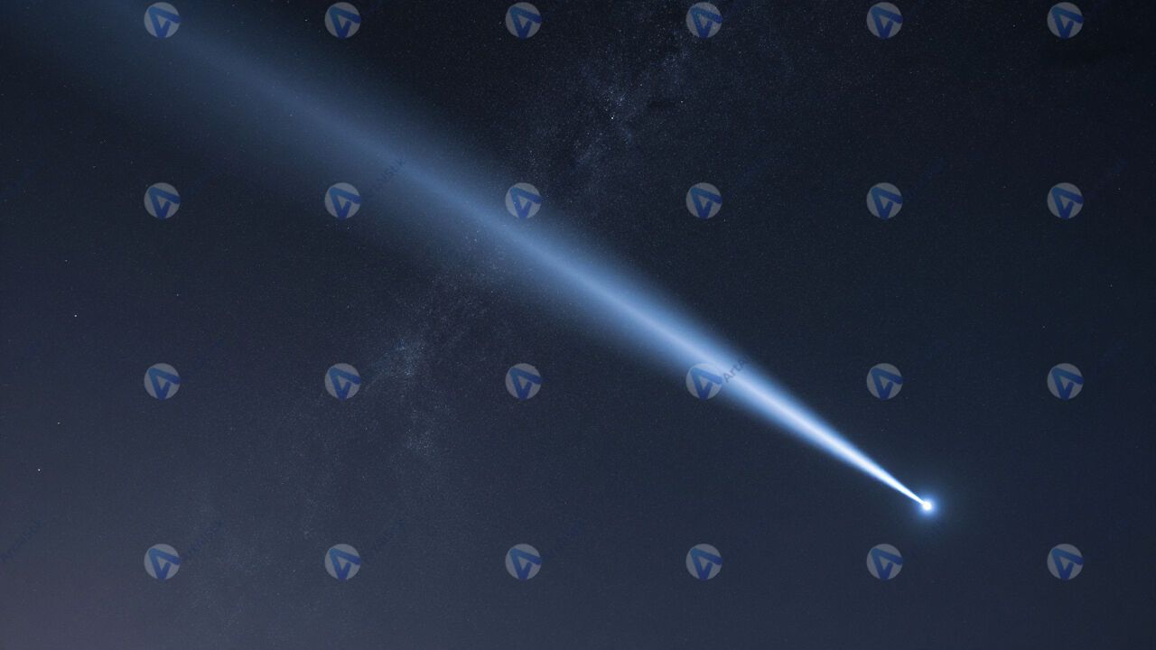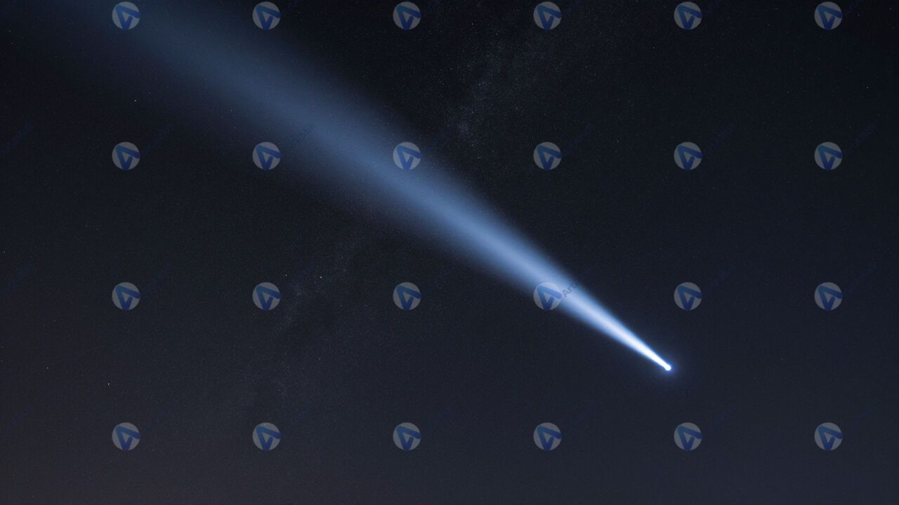 Комета с ярким хвостом на фоне звёздного неба.