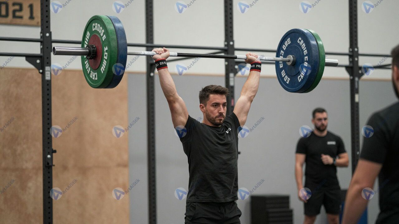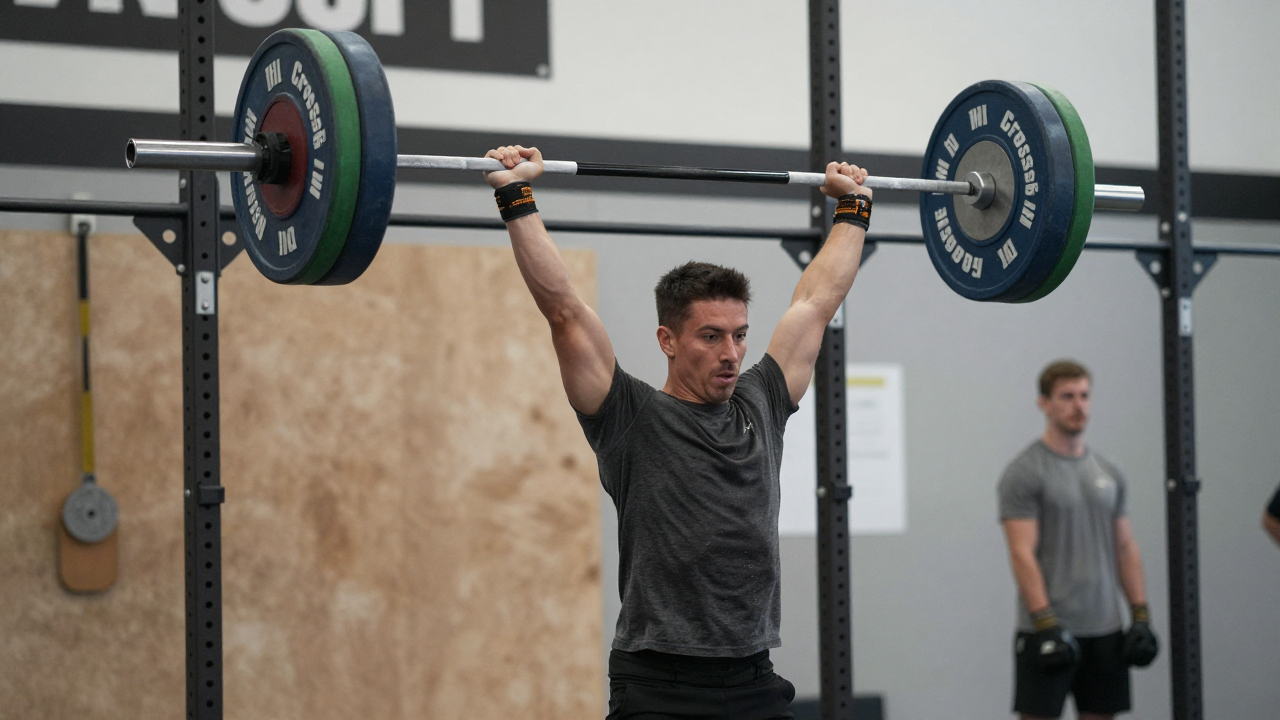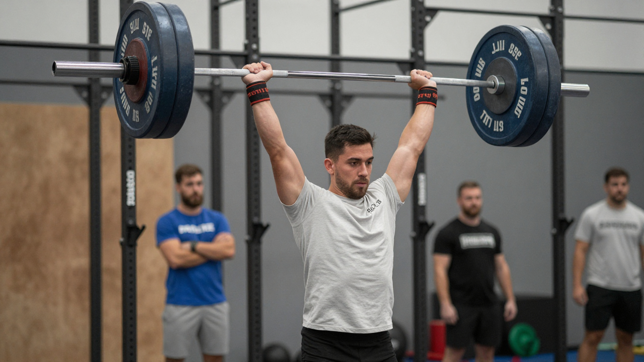 Соревнования по кроссфиту, участник поднимает штангу над головой.