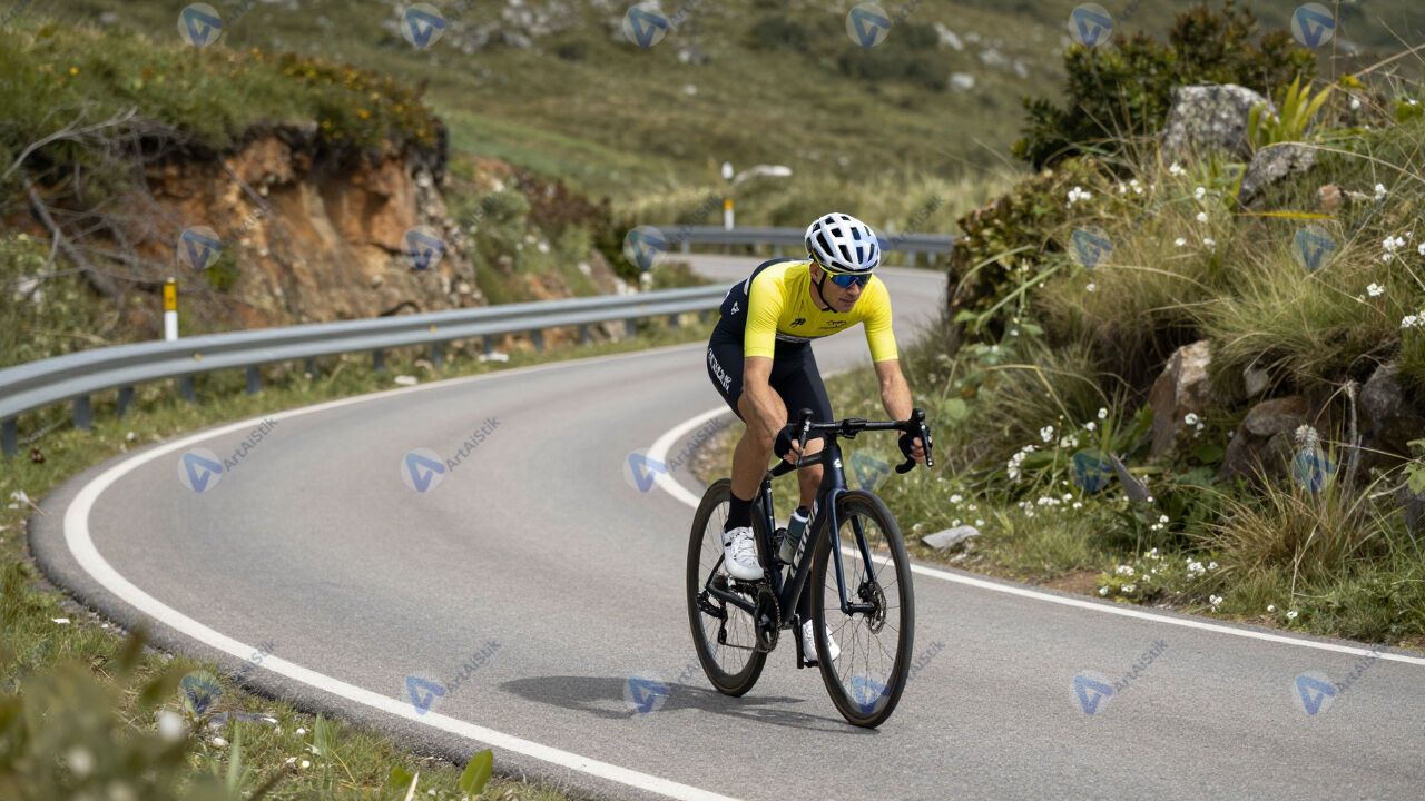 Велосипедист поднимается в гору по серпантину.