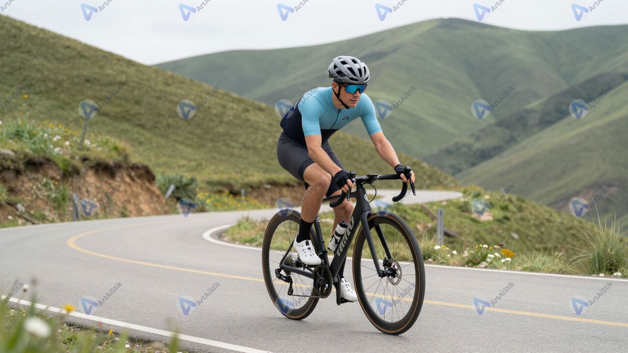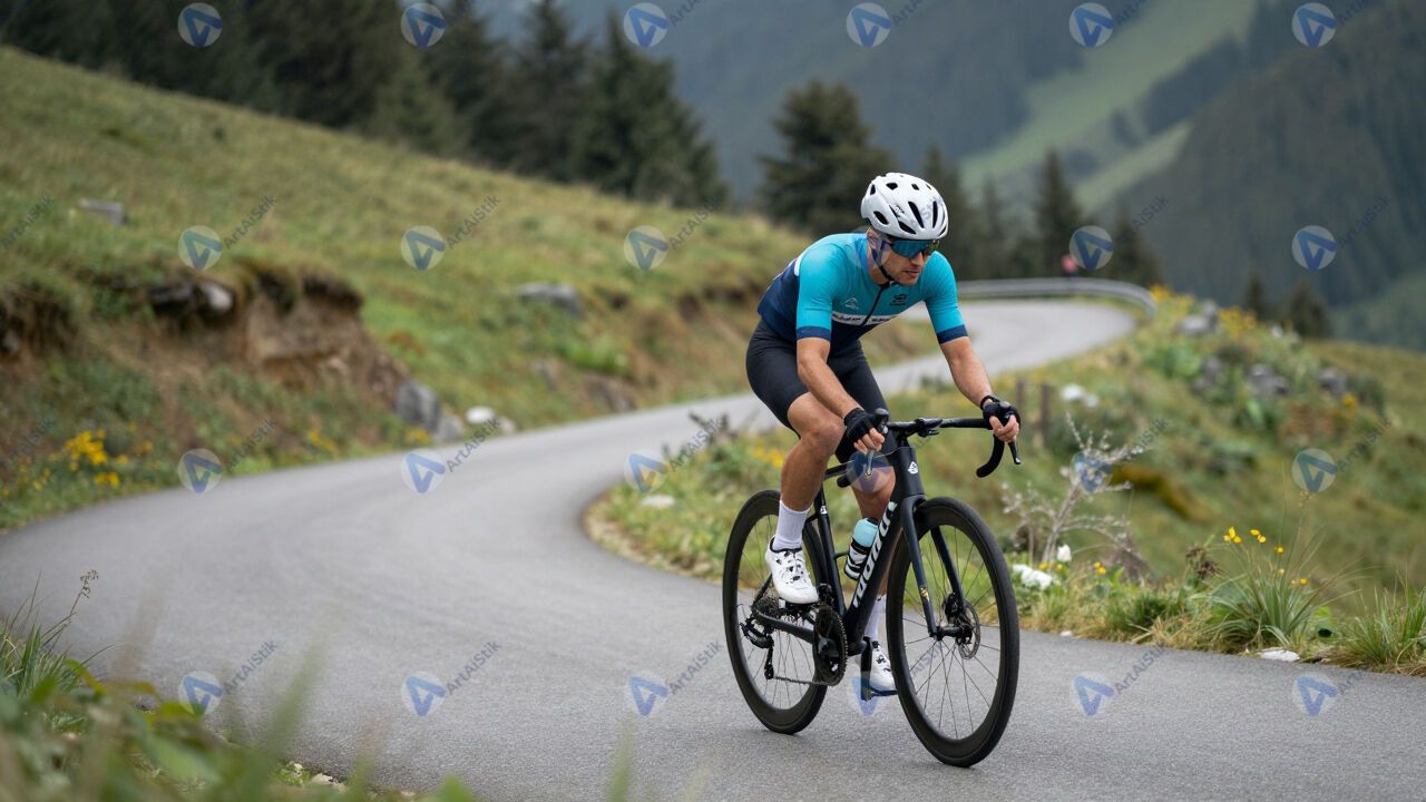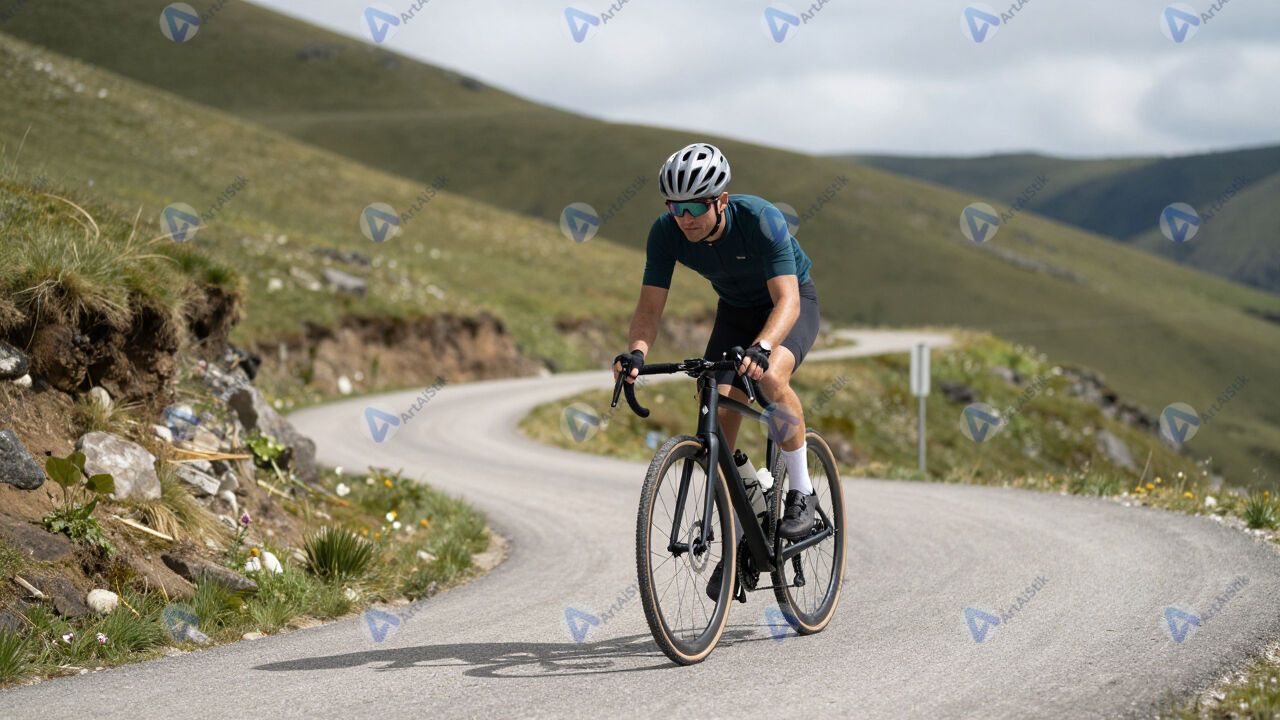 Велосипедист в шлеме на горном серпантине.