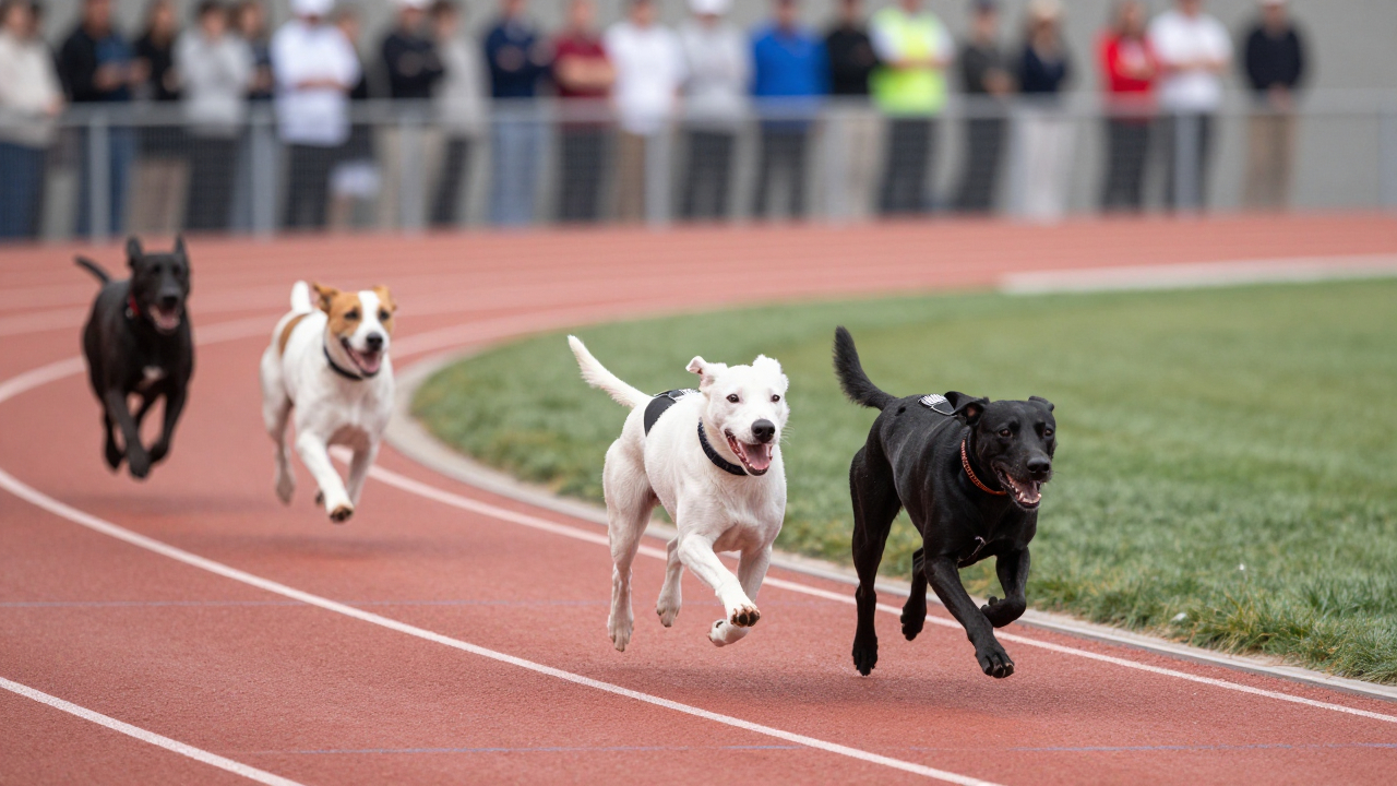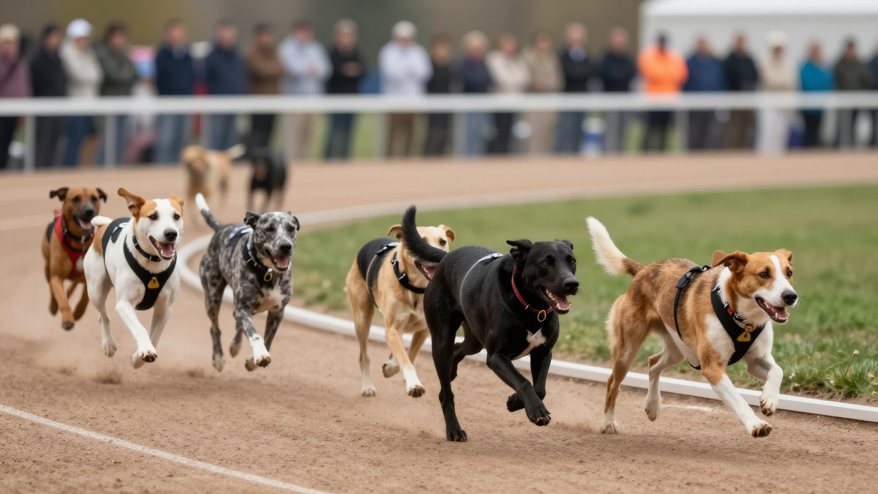 Собачьи бега, собаки в намордниках мчатся по треку.