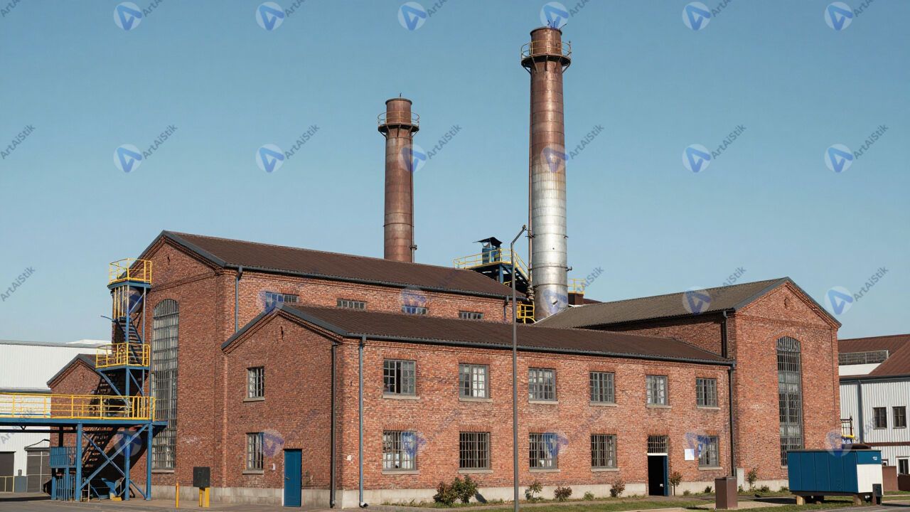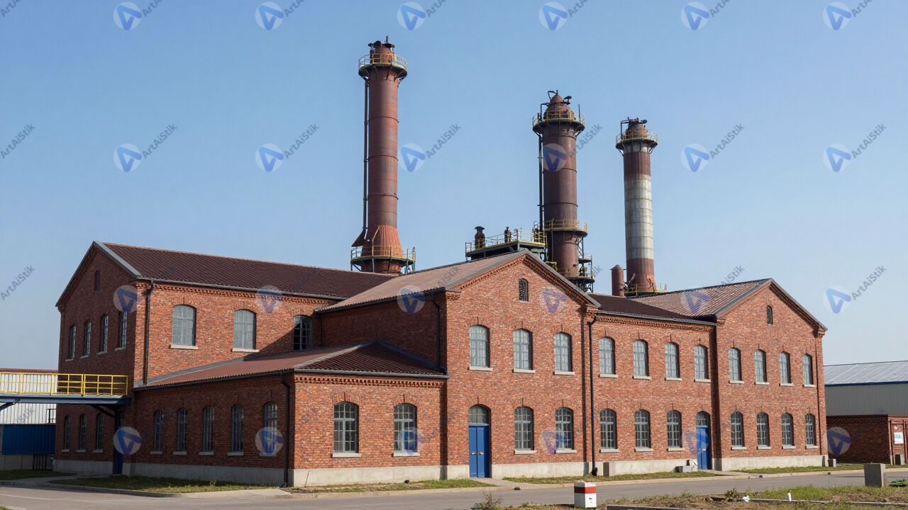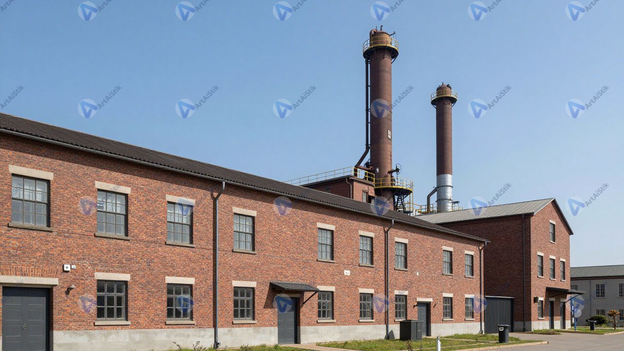 Фабрика с красными кирпичными корпусами и высокими трубами.