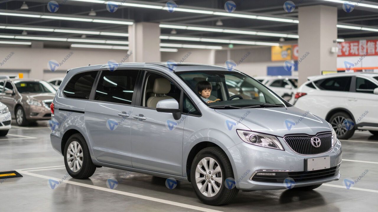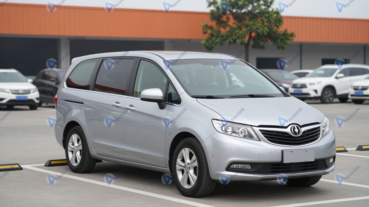 Семейный минивэн на парковке у супермаркета.
