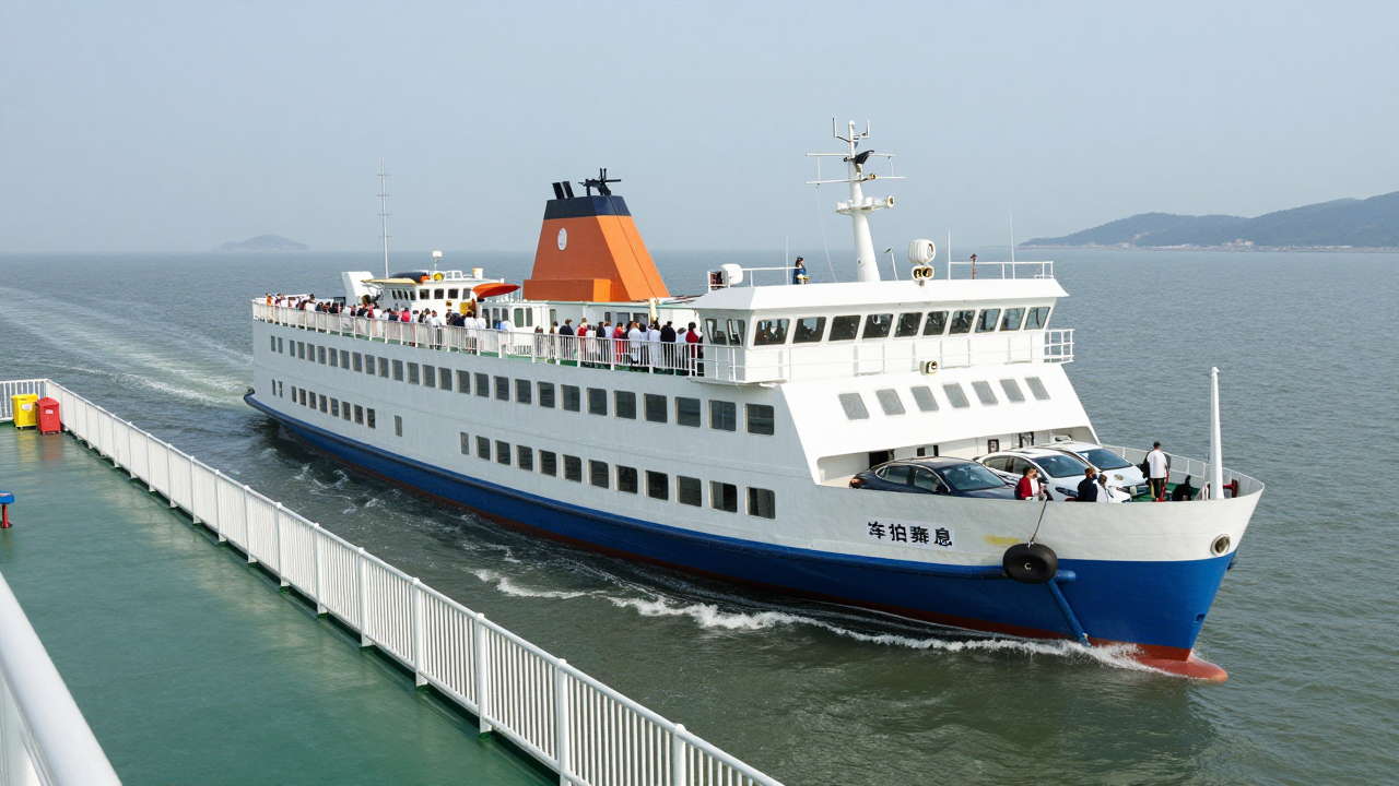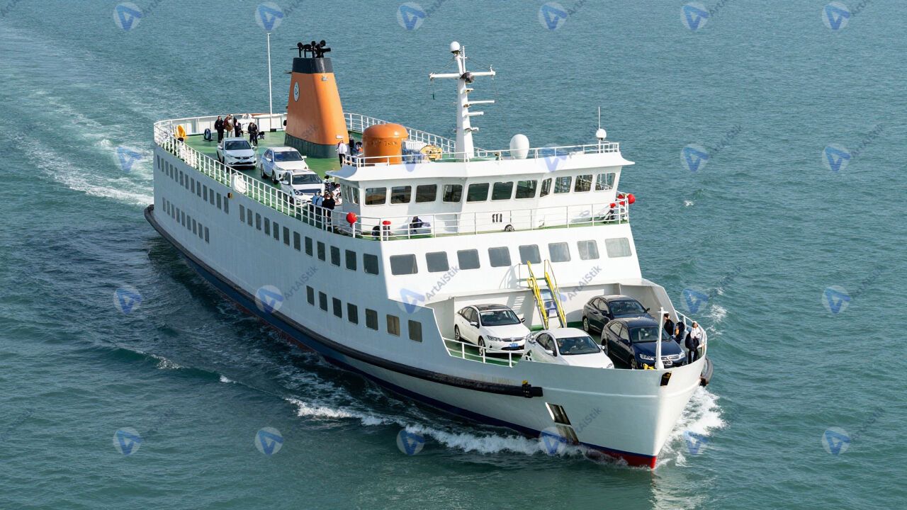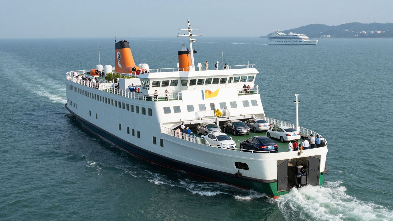 Паром перевозит пассажиров и автомобили, вид с верхней палубы.