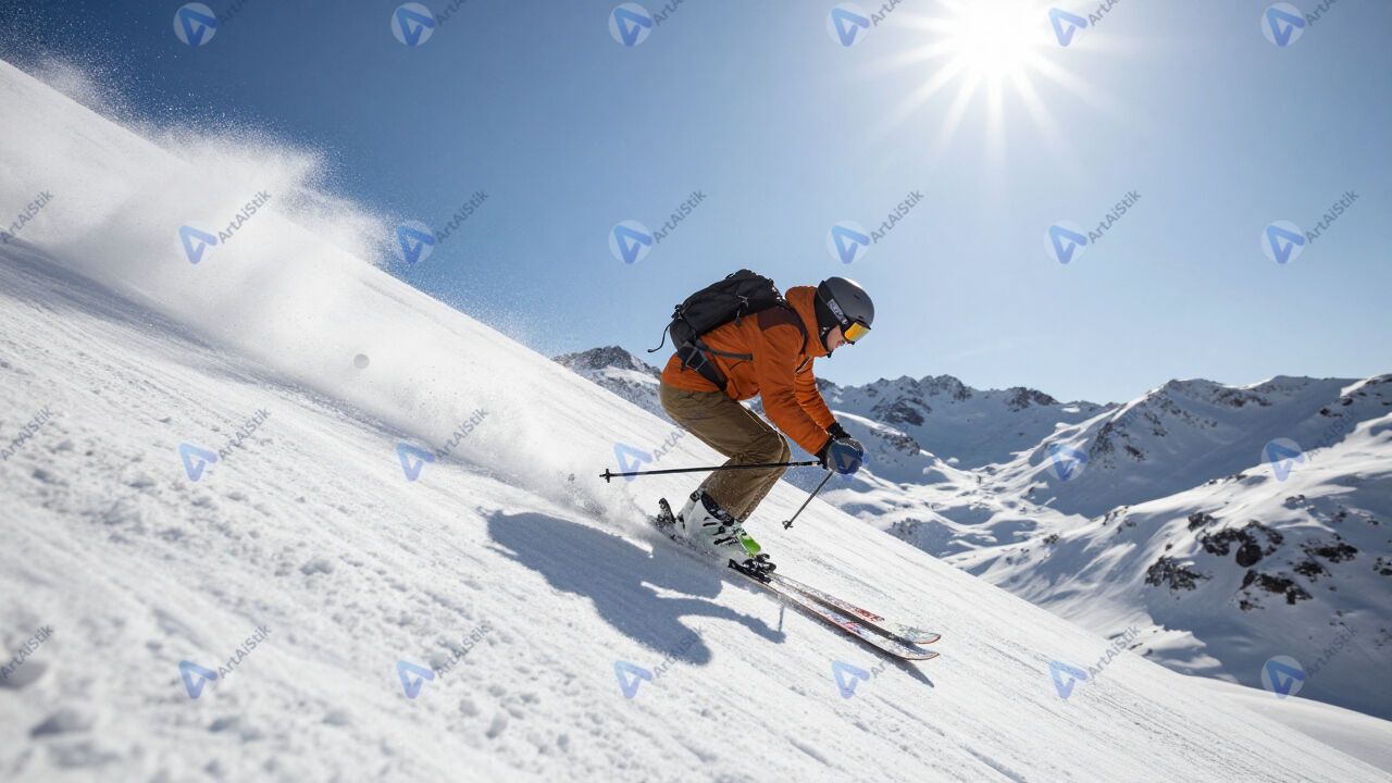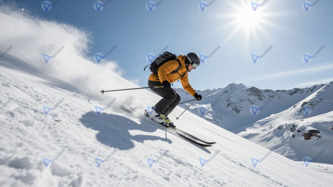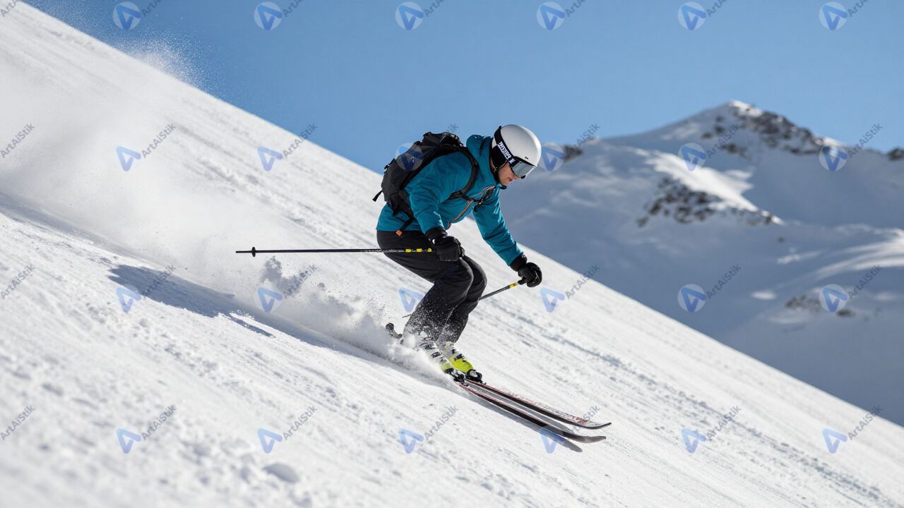 Фрирайдер на лыжах спускается по крутому кулуару.