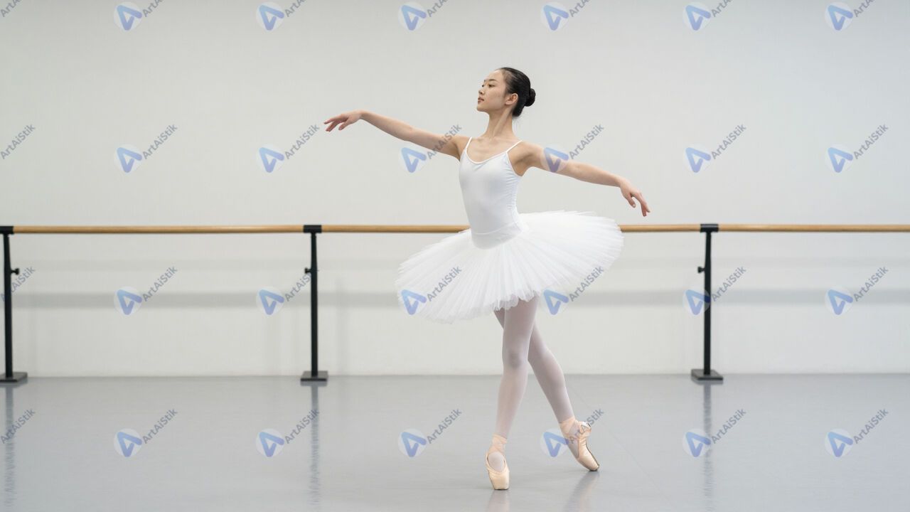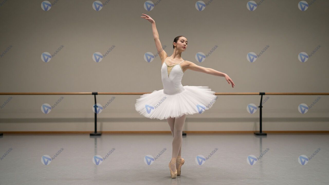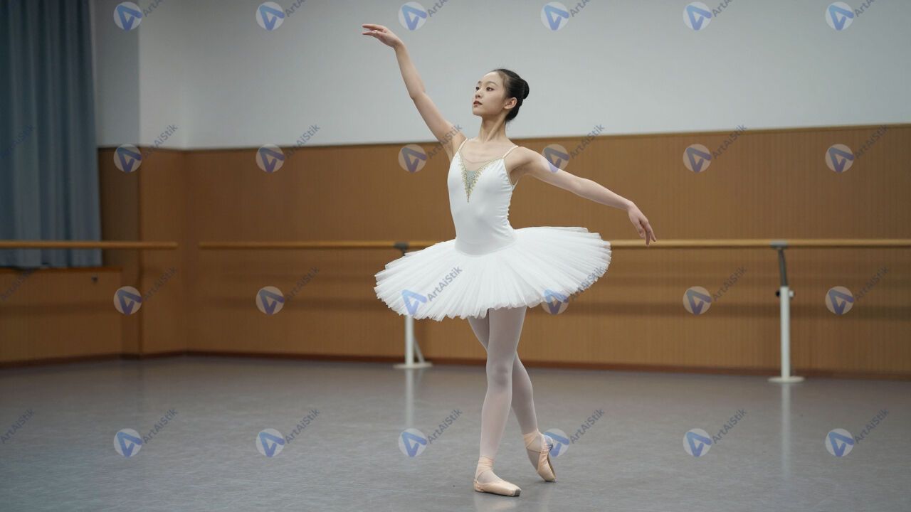 Девочка в балетной пачке на репетиции в зале.