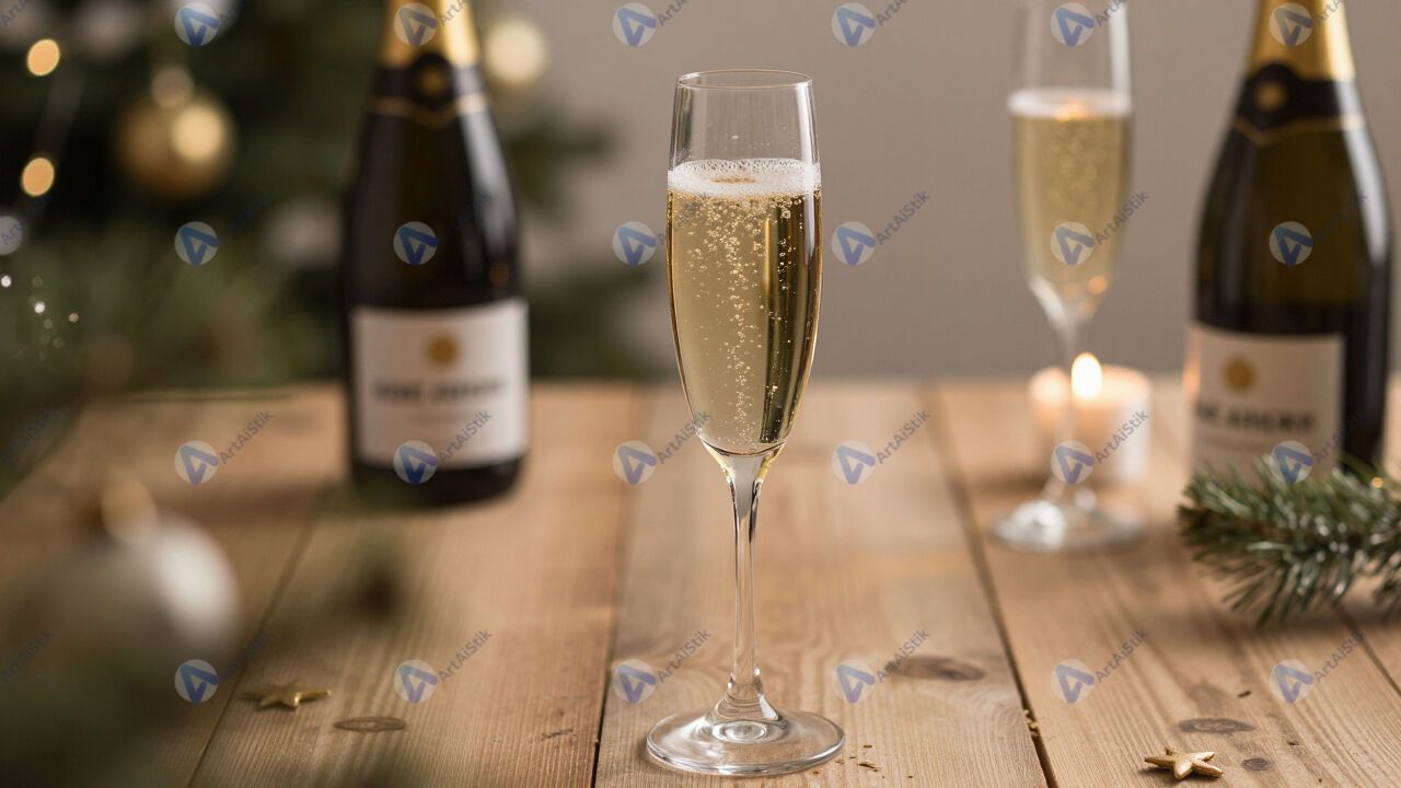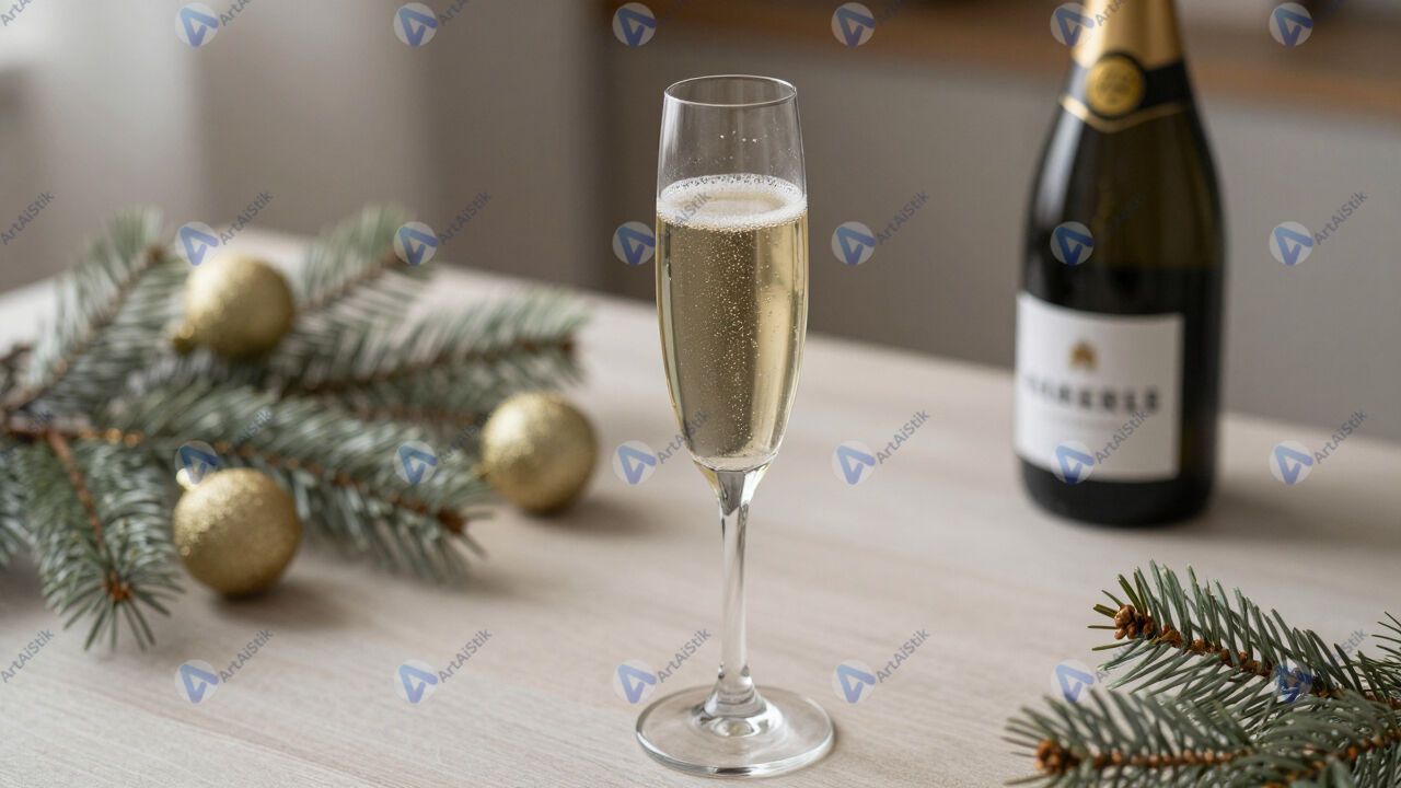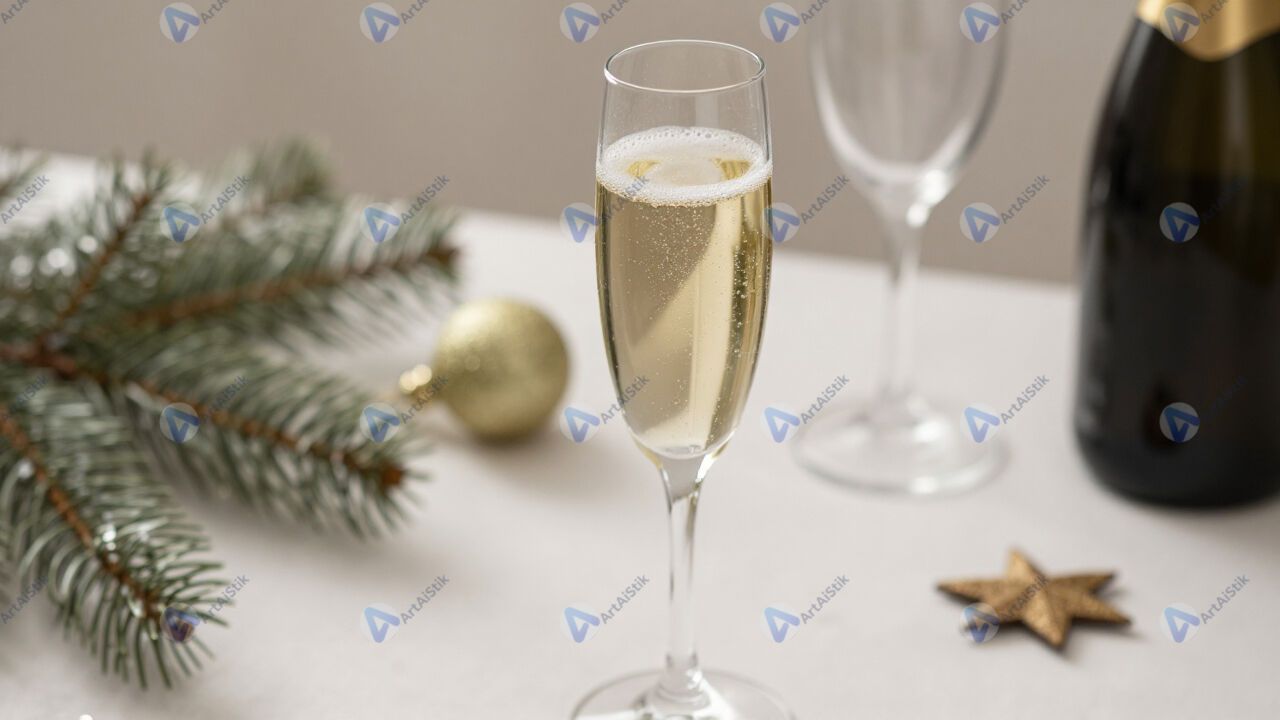 Бокал шампанского с пузырьками на праздничном столе.