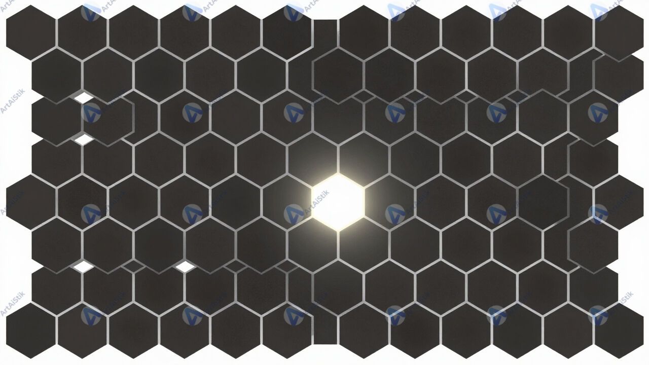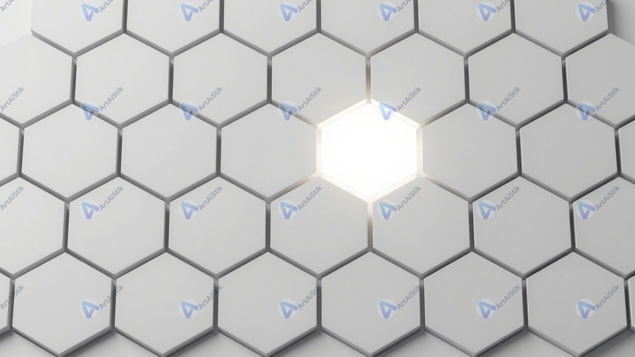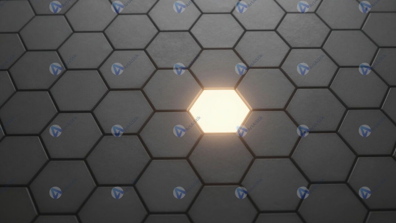 Сетка шестиугольников с одним выделенным ярким элементом.