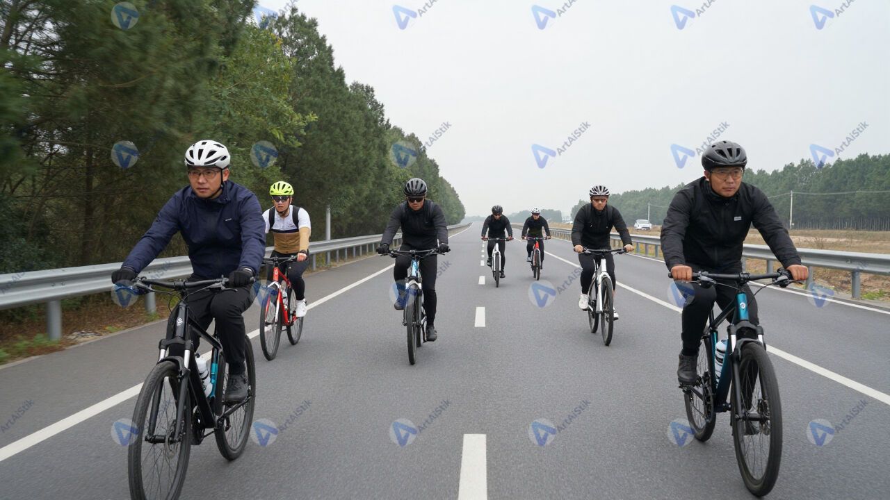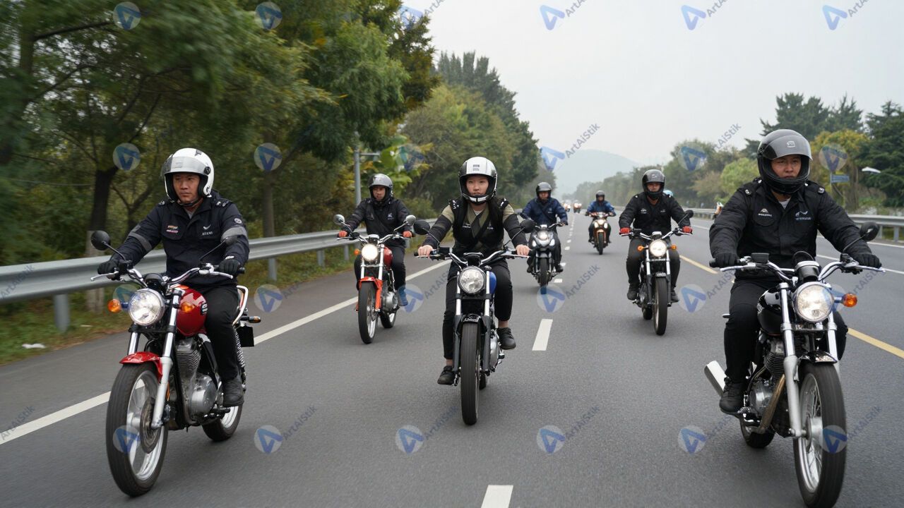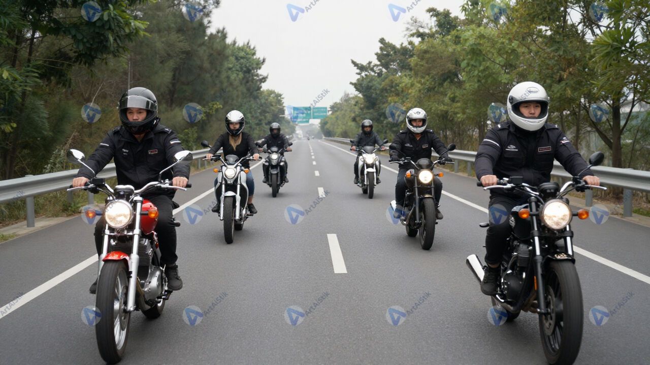 Группа байкеров едет колонной по шоссе.