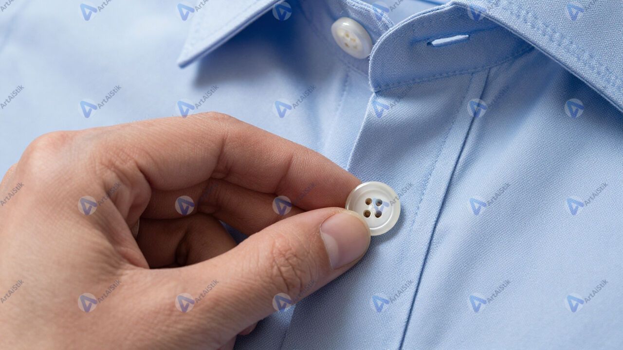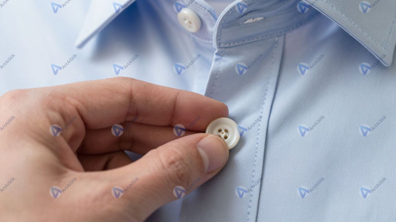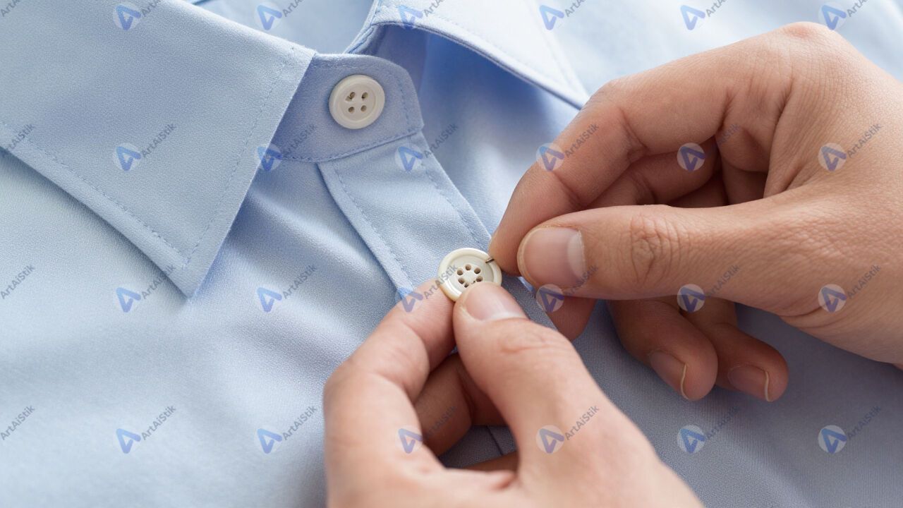 Рука пришивает пуговицу к рубашке крупным планом.