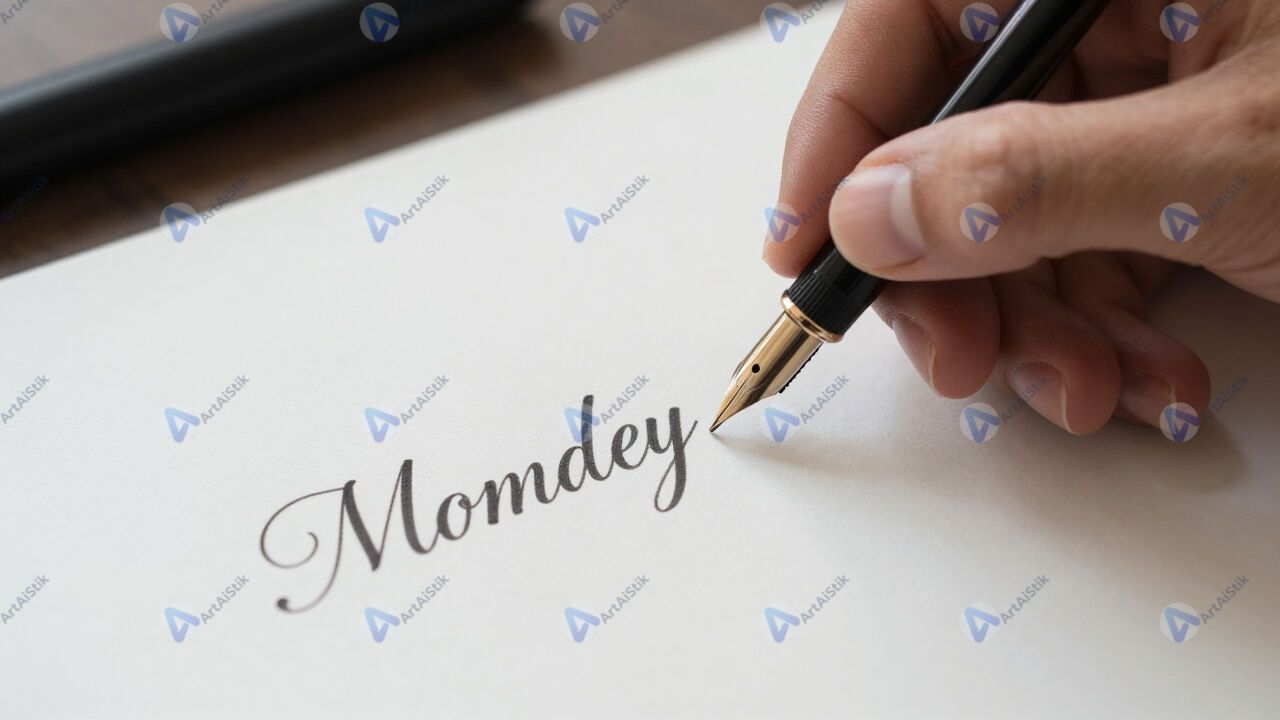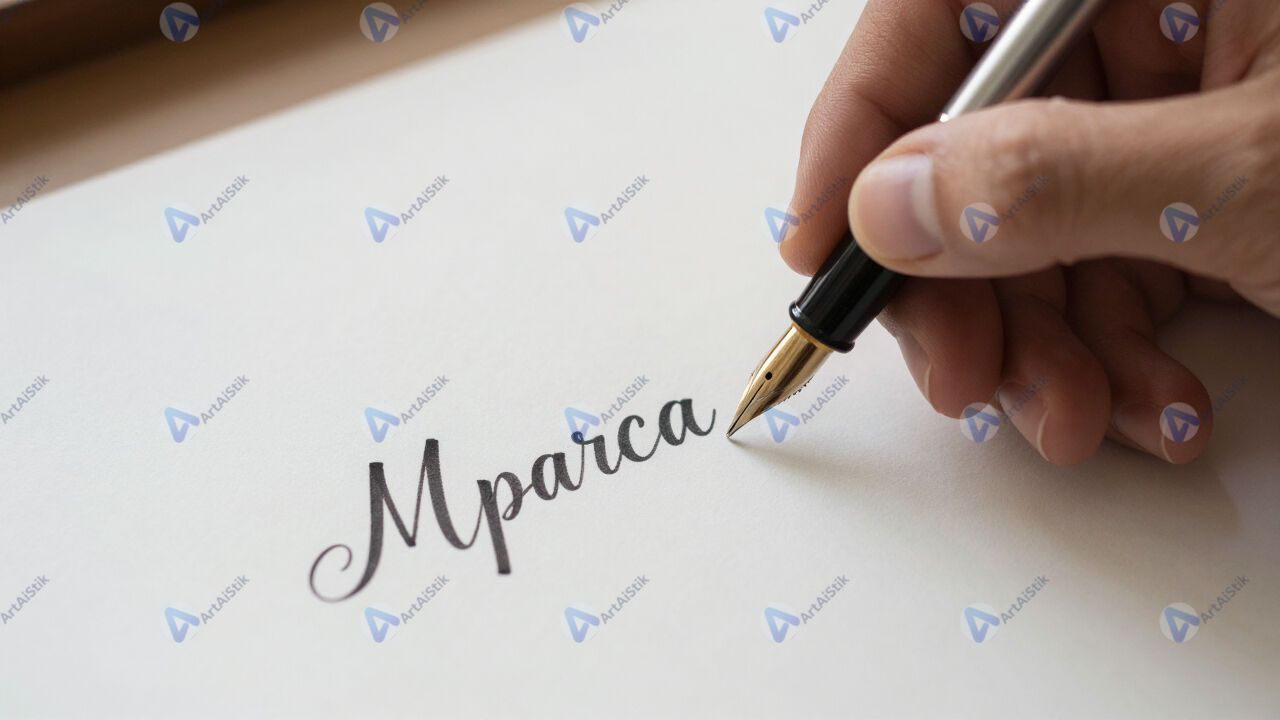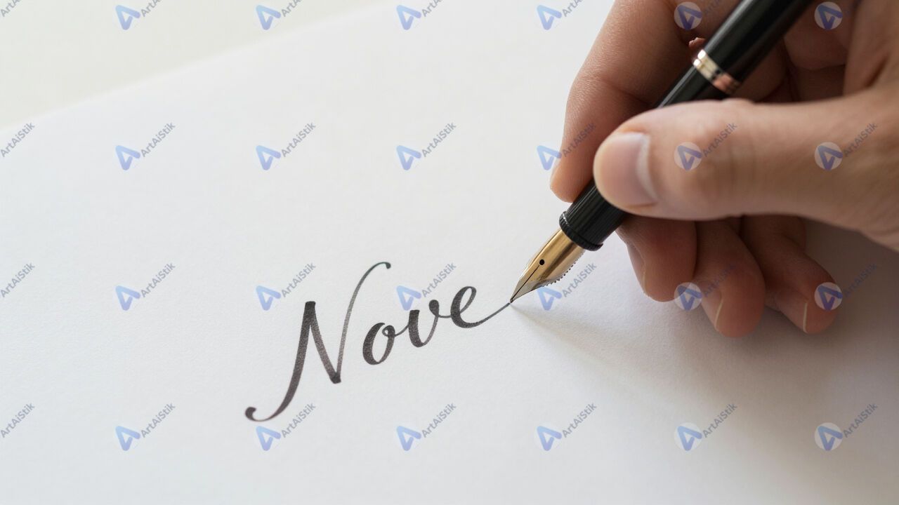 Рука с перьевой ручкой выводит каллиграфические буквы на бумаге.