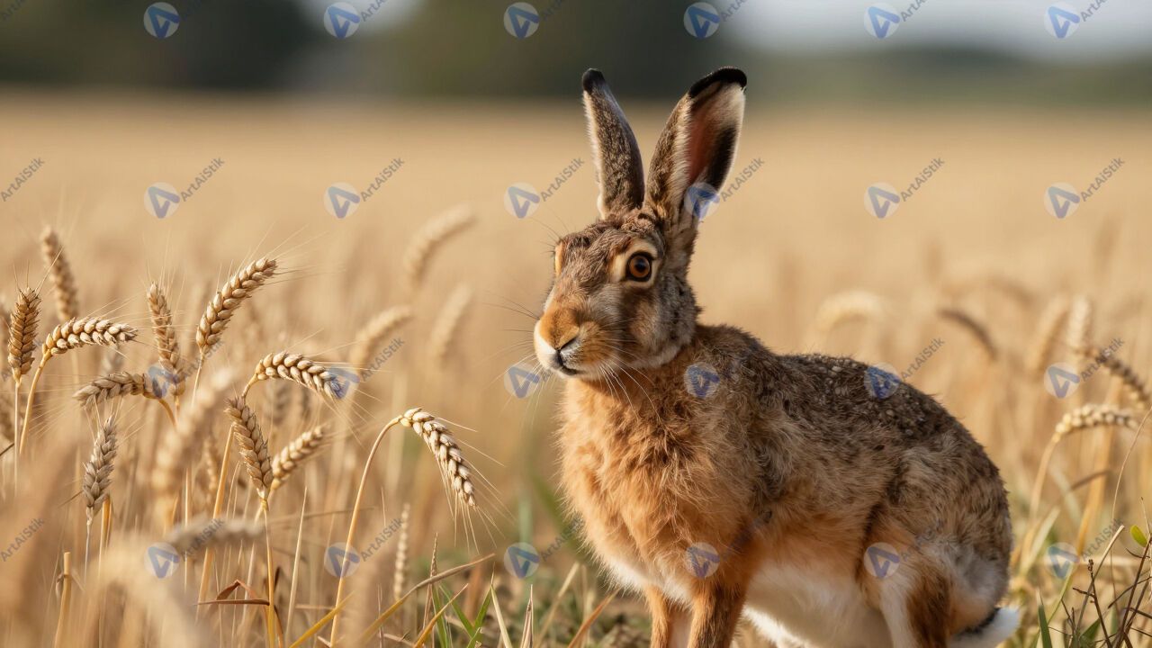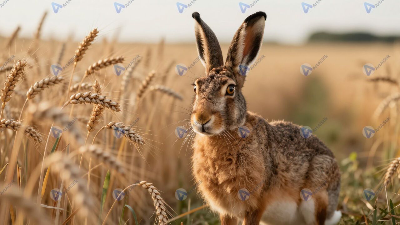 Заяц в поле с колосящейся пшеницей, уши, лето.