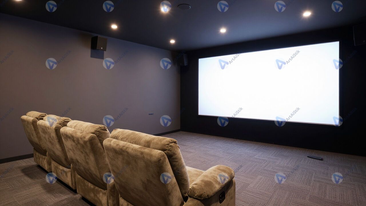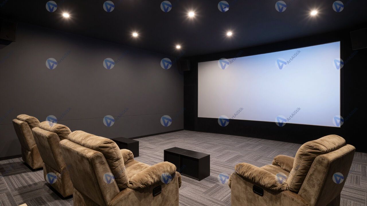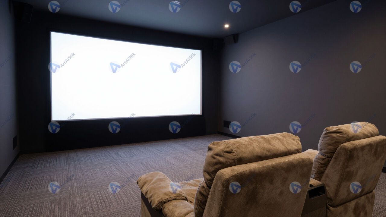Домашний кинозал с большим экраном и креслами‑реклайнерами.