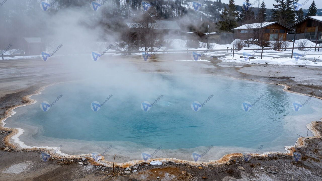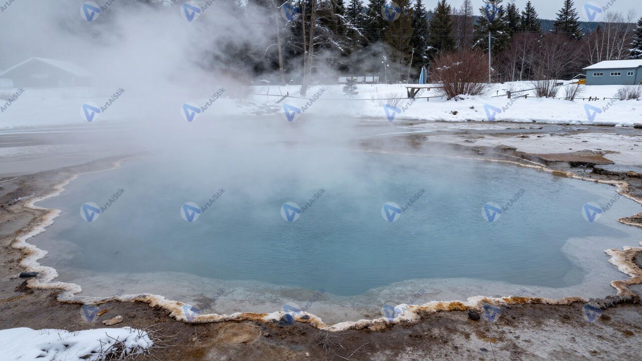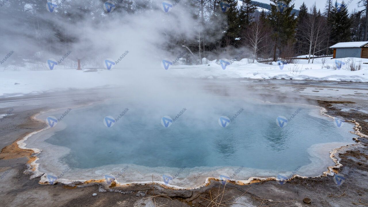 Горячий источник в снегу, пар, бирюзовая вода.