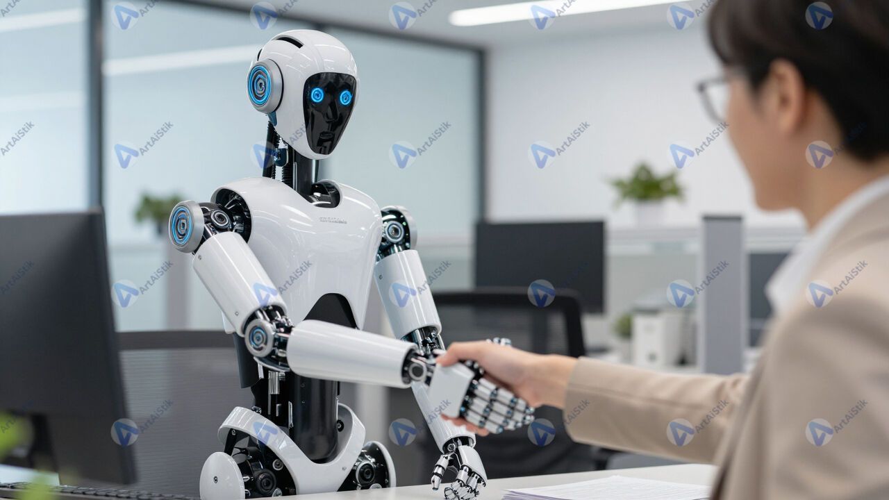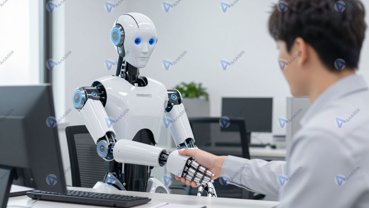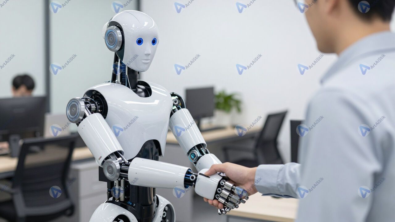 Гуманоидный робот пожимает руку человеку в офисе.