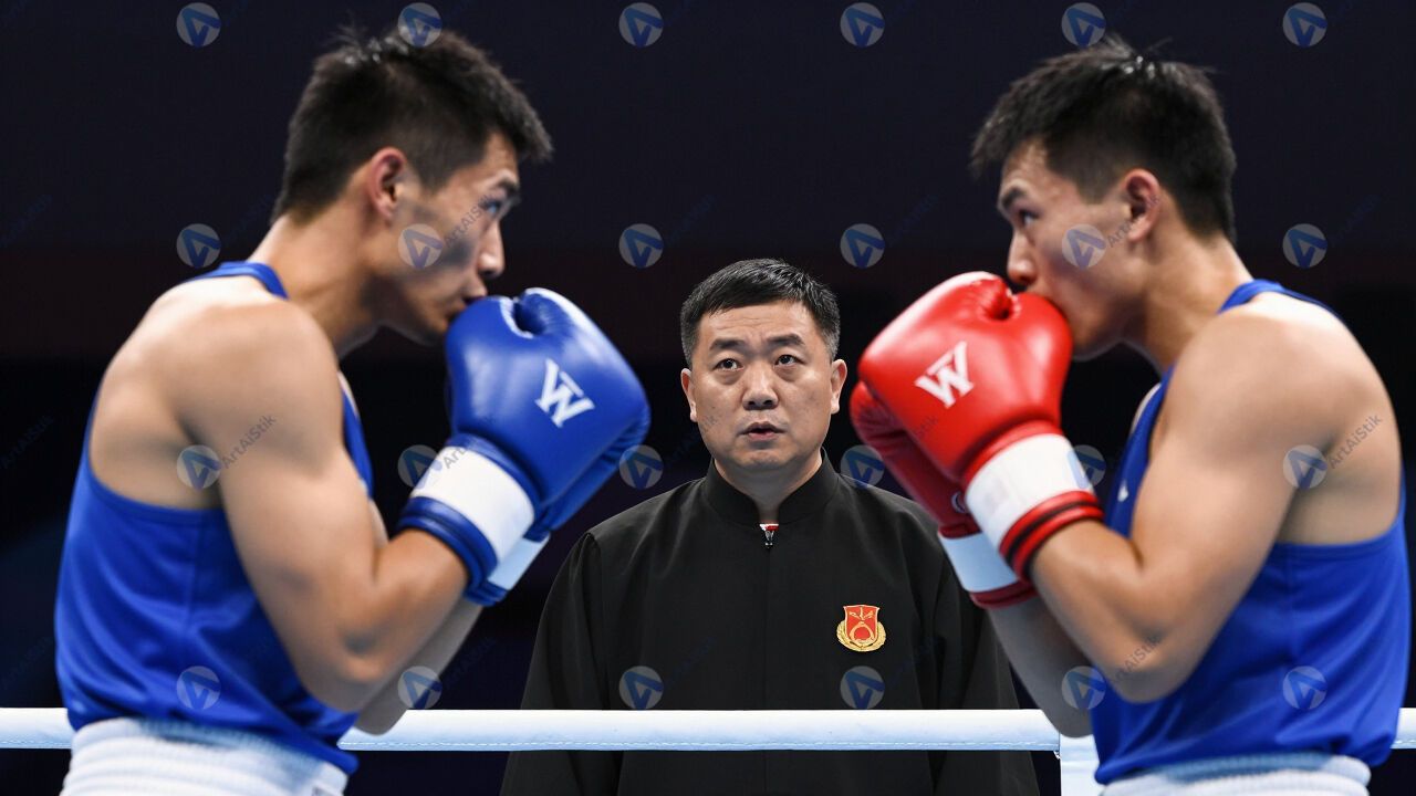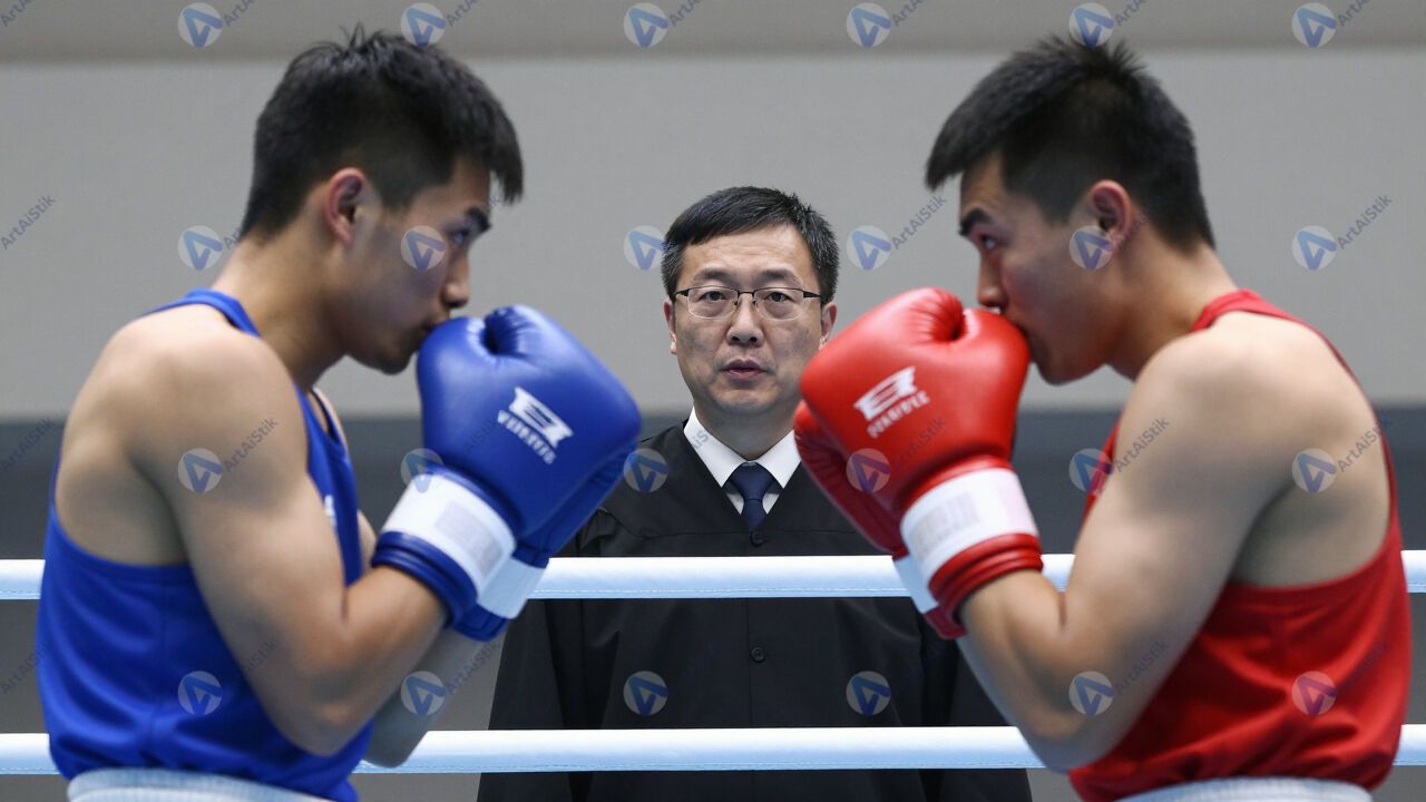 Судья во время боксерского матча внимательно следит за бойцами.