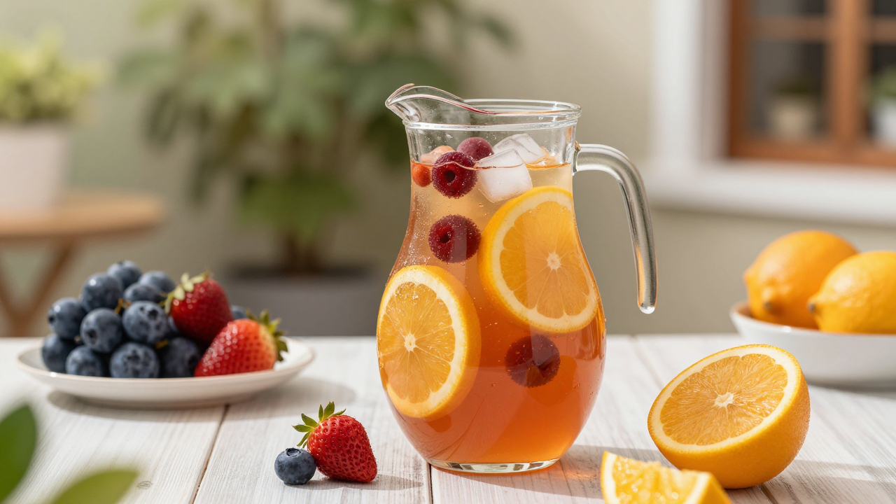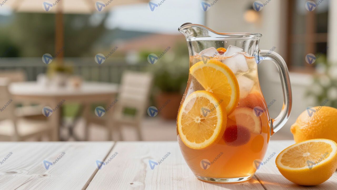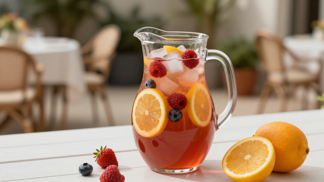 Кувшин с сангрией, фрукты и лёд, летняя терраса.